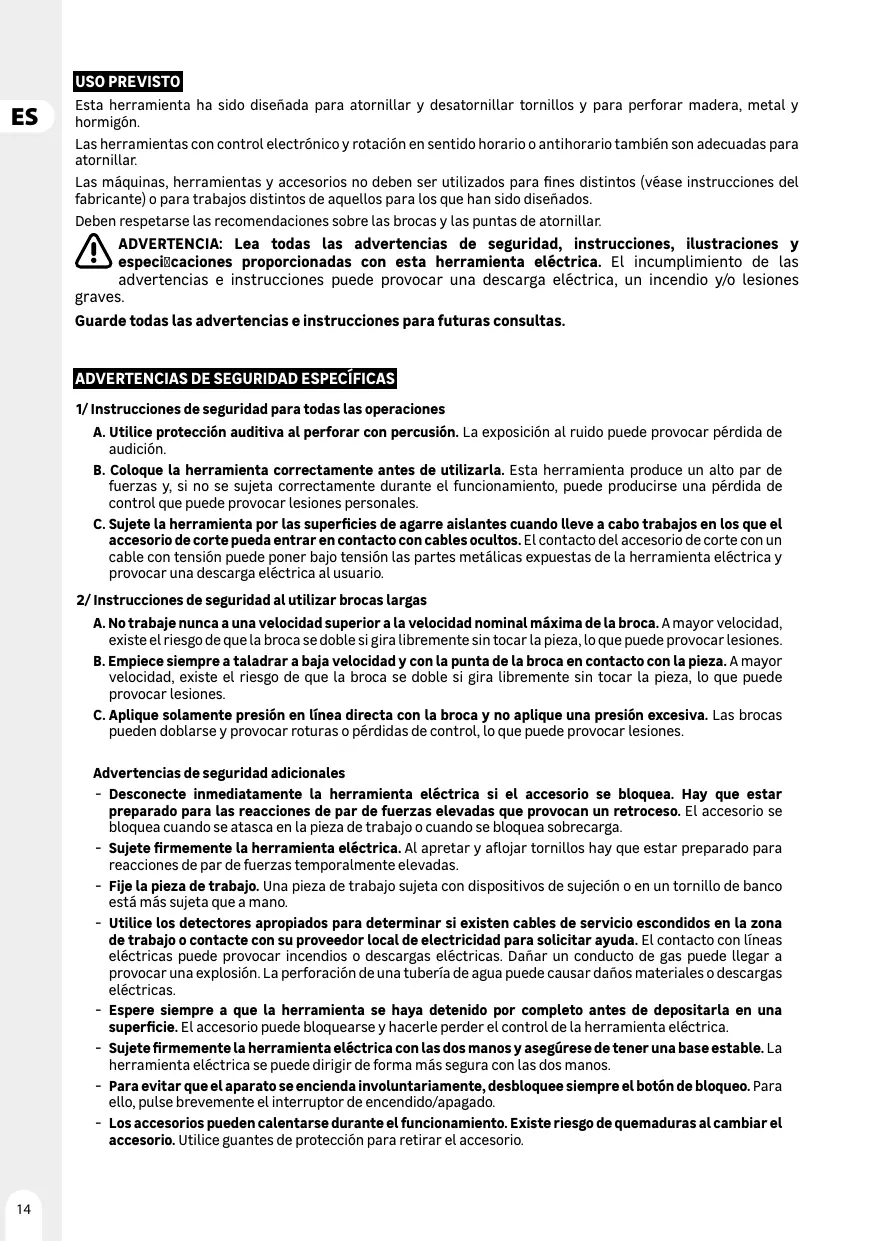 - Riesgo de electrocuciôn al perforar cables eléctricos - Sujete siempre la herramienta por Las empuñaduras y no toque las brocas.