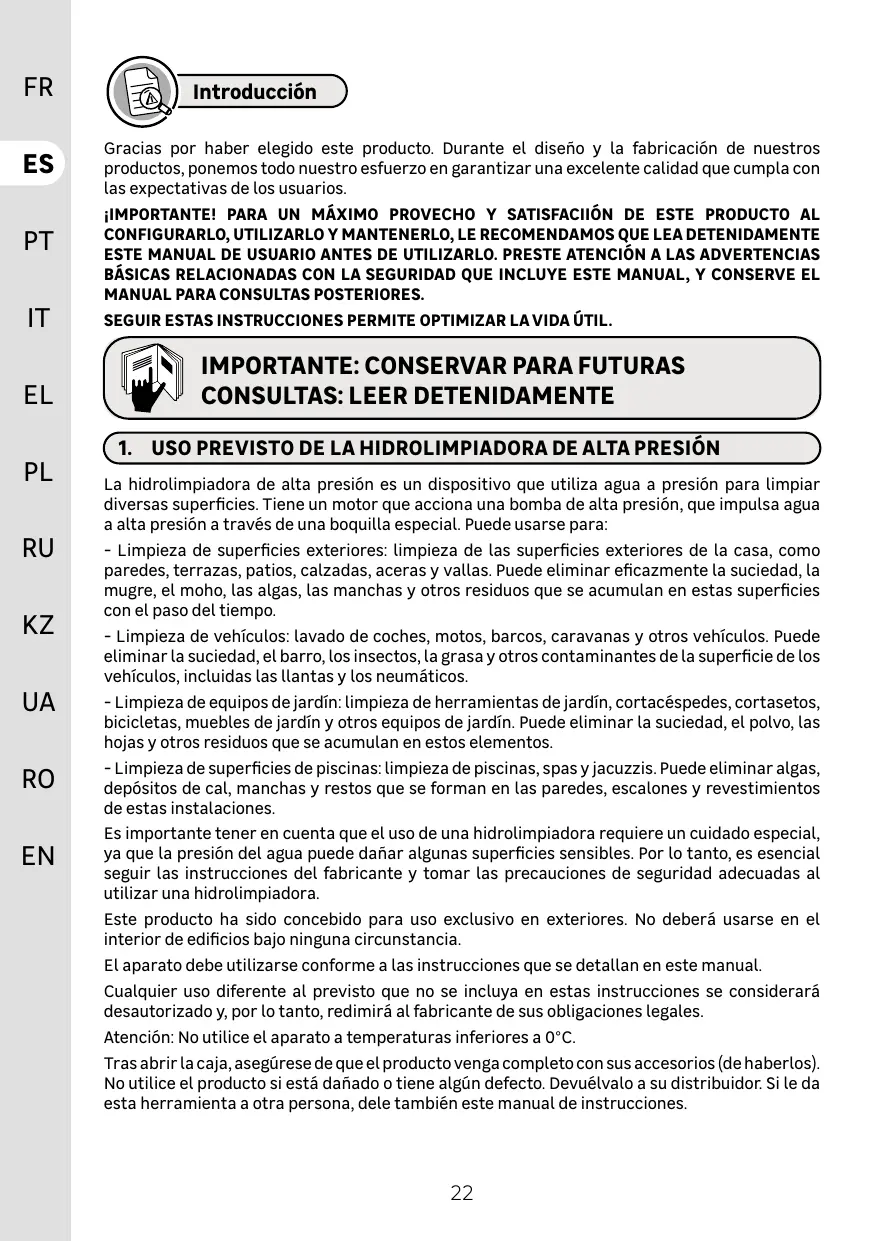 A IMPORTANTE: CONSERVAR PARA FUTURAS CONSULTAS: LEER DETENIDAMENTE QG. USO PREVISTO DE LA HIDROLIMPIADORA DE ALTA PRESIÔN )