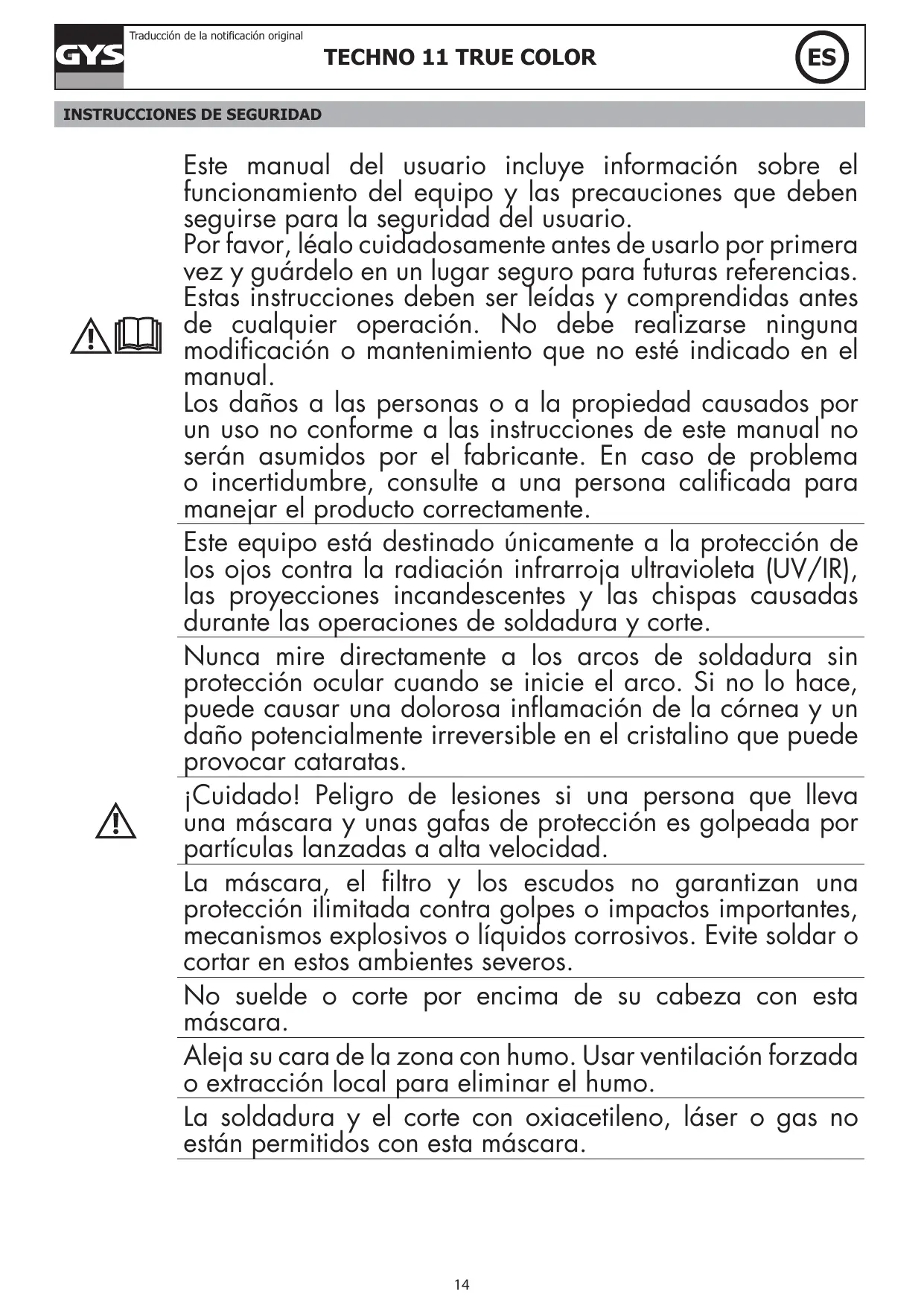 Traduccién de la notificacién original TECHNO 11 TRUE COLOR (Es) Antes de cada uso: - Inspeccione cuidadosamente la méscara y su filtro UV/IR. - Reemplace las partes desgastadas © dañadas inmediatamente. -Reemplace los lentes defiltro o las caretas si estén agrietados o rayados para evitar daños en los ojos del usuario. La cinta para la cabeza puede causar potencialmente alergias en personas sensibles. Las temperaturas de funcionamiento del filtro optoelectrénico son de -5°C a +55°C. El filtro optoelectrénico de la méscara no es impermeable y no funcionaré correctamente si ha estado en contacto con el agua. La careta de soldar debe moverse con cuidado para evitar que se dañe el filtro, los protectores y/o la cubierta protectora. Mantenimiento : e No coloque objetos o herramientas pesadas sobre o en la mascarilla para evitar dañar el filtro o las caretas. e Las temperaturas de almacenamiento de las mâscaras oscilan entre -10°C y +60°C. e Limpie el filtro optoelectrénico con un algodén limpio o un paño especial para lentes. e Limpiaycambialas pantallas delosguardiasregularmente. e Limpie el interior y el exterior de la mäscara con un detergente-desinfectante neutro. No use disolventes. e Aseguürate de que los sensores y la célula no se obstruyan con polvo o escombros. e Recomendamos usar la méscara y los visores durante 5 años. La duracién del uso depende de diversos faciores, como el tipo de uso, la limpieza, el almacenamiento y el mantenimiento.