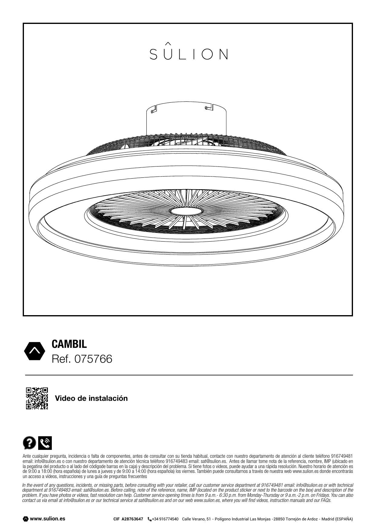 Ante cualquier pregunta, incidencia o falta de componentes, antes de consultar con su tienda habitual, contacte con nuestro departamento de atenciôn al cliente teléfono 916749481 email info@sulion.es o con nuestro departamento de atenciôn técrica teléfono 916749483 emal: sat@sulion.es. Antes de llamar tome nota de la referencia, nombre, IMP (ubicado en la pegatina del producto o al lado del cédigode barras en la caja) y descripciôn del problema, Si tiene fotos o videos, puede ayudar a una répida resoluciôn. Nuestro horario de atencién es de 9:00 a 18:00 (hora española) de lunes a jueves y de 9:00 a 14:00 (hora española) los viernes. También puede consultamos à través de nuestra web wun:sulion.es donde encontrarés un acceso a videos, instrucciones y una quia de pregunts frecuentes