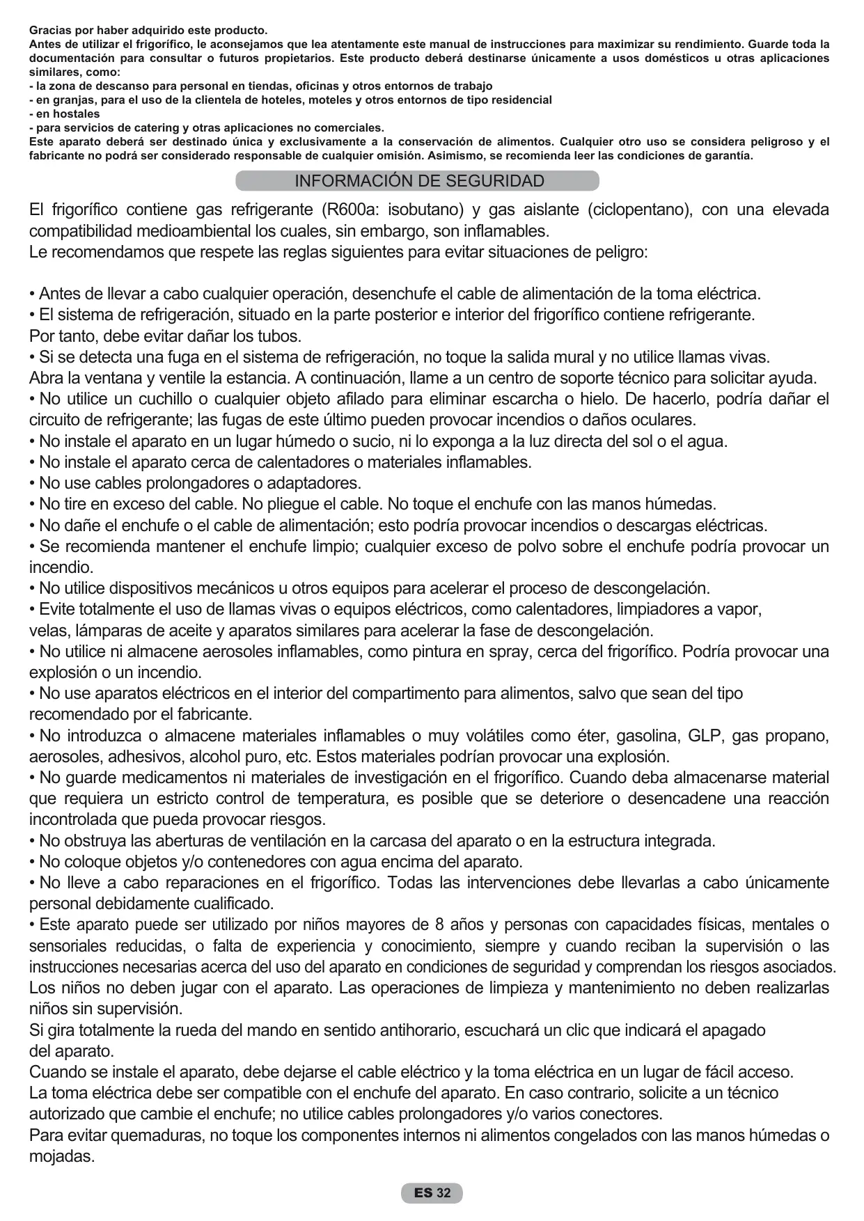 INFORMACION DE SEGURIDAD El frigorifico contiene gas refrigerante (R600a: isobutano) y gas aislante (ciclopentano), con una elevada compatibilidad medioambiental los cuales, sin embargo, son inflamables. Le recomendamos que respete las reglas siguientes para evitar situaciones de peligro: