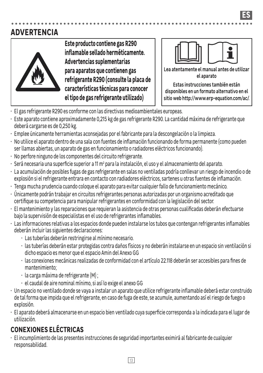 + La stagnation de fuites possibles de gaz réfrigérant dans des pièces non ventilées peut entraîner un risque d'incendie ou d'explosion si Le réfrigérant entre en contact avec des radiateurs électriques, des poêles ou d'autres sources d'inflammation.