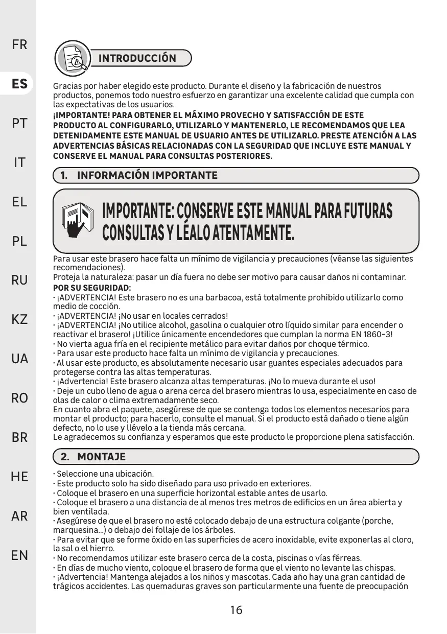 - ATTENTION! Ce brasero n'est pas un barbecue, il est fortement interdit de l'utiliser comme moyen de cuisson.