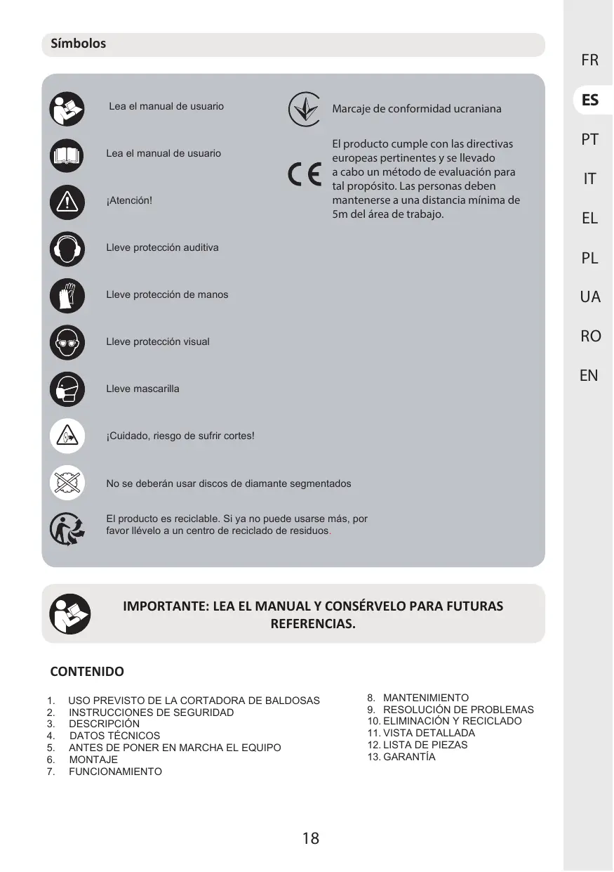 1. USO PREVISTO DE LA CORTADORA DE BALDOSAS Esta mäquina esté diseñada para cortar ladrillos, piedras, baldosas, etc. La mâquina no es para un uso profesional.