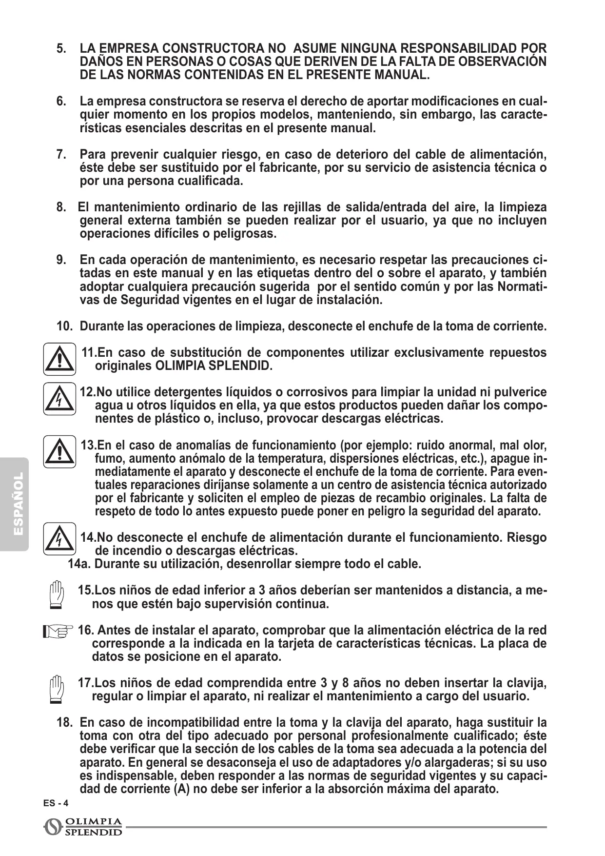 11.En cas de remplacement de composants, utiliser exclusivement des pièces de rechange originales OLIMPIA SPLENDID.