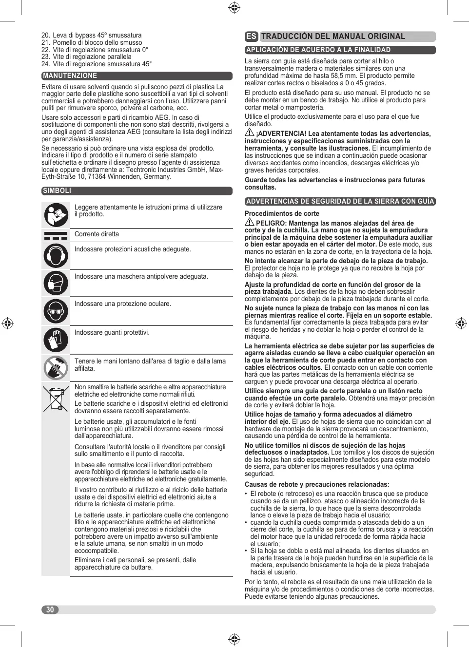 MANTENIMIENTO Evite el uso de disolventes para la limpieza de los componentes de pléstico. La mayoria de los plésticos son sensibles a diferentes tipos de disolventes comerciales y su uso puede provocar daños. Utlice paños limpios para quitar la suciedad, la carbonilla, etc. Utilice exclusivamente accesorios AEG y piezas de recambio AEG. Si es necesario susituir algün componente que no se haya descrito, péngase en contacto con nuestro agente de servicio de AEG (ver nuestra lita de direcciones de garantialmantenimiento) Si fuera necesario, se puede solicitar una vista ampliada del producto. Indique el tipo de producto y el nümero de serie que aparecen impresos en la etiqueta, y solicite el esquema à sus agentes de servicio locales o directamente a: Techironic Industries GmbH, Max-Eyth-Strañe 10, 71364 \Winnenden, Germany.
