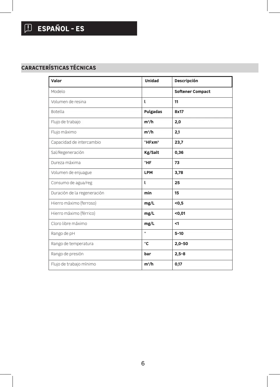 | Características técnicas principales | Sistema de descalcificación por intercambio iónico, capacidad de tratamiento adecuada para hogares |