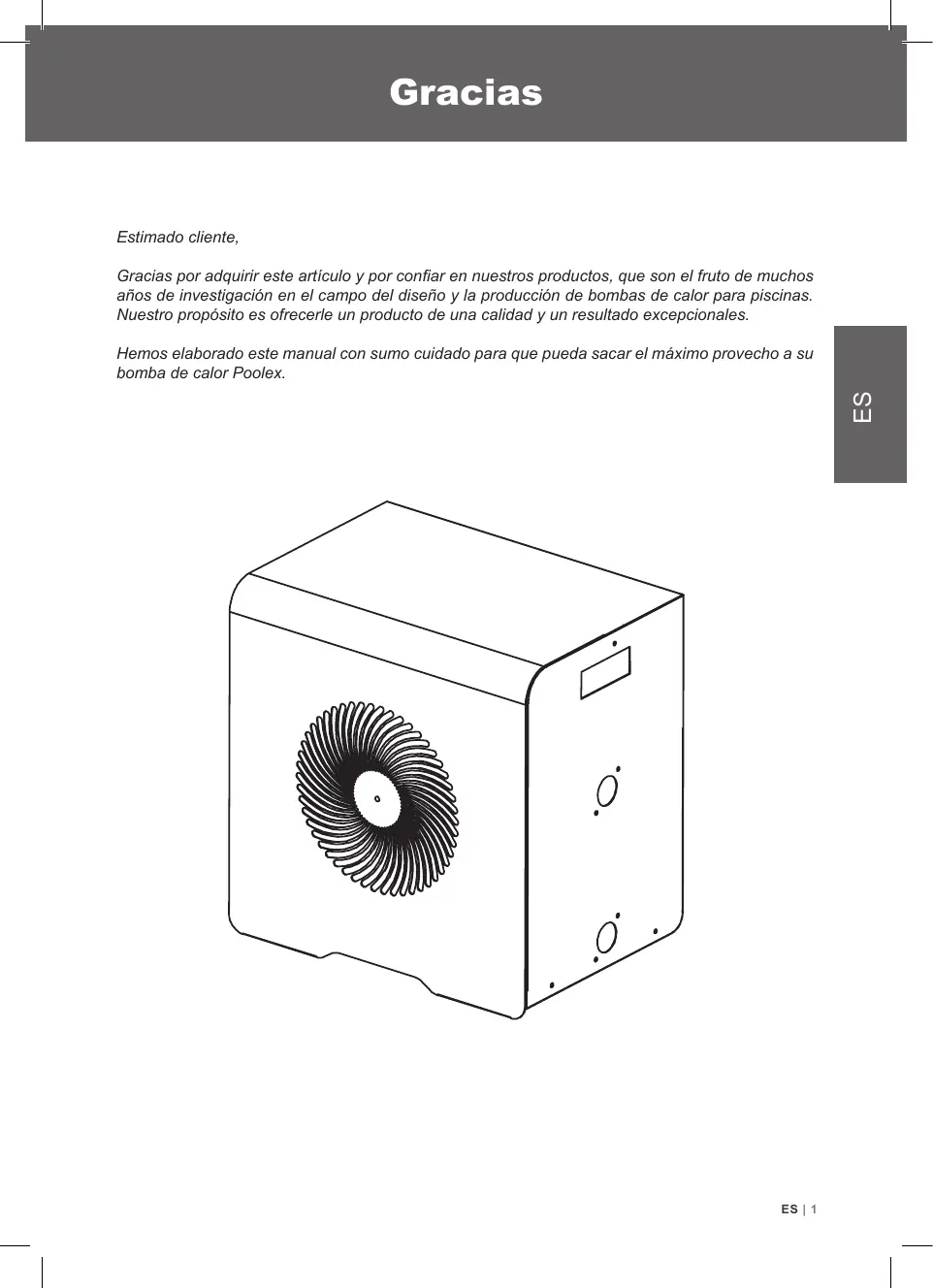 Gracias por adquirir este articulo y por confiar en nuestros productos, que son el fruto de muchos años de investigaciôn en el campo del diseño y la producciôn de bombas de calor para piscinas. Nuestro propésito es ofrecerle un producto de una calidad y un resultado excepcionales.