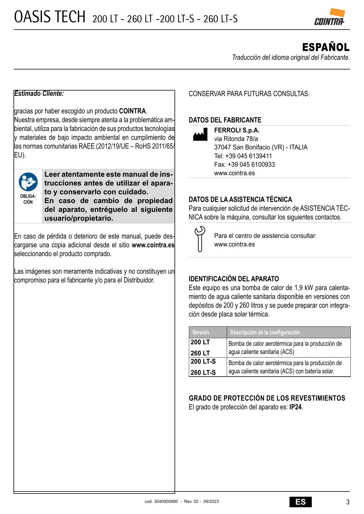 MANUAL DE USUARIO OASIS TECH 200 LT - 260 LT - 200 LT-S - 260 LT-S COINTRA