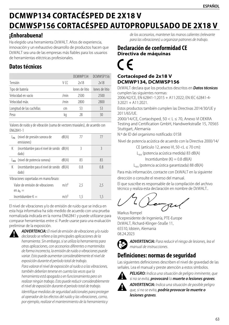 DEWALT certifie que ces produits décrits dans la section Caractéristiques techniques sont en conformité avec 2006/42/CE, EN 62841-1:2015 + A11:2022; EN IEC 62841-4- 32021 + A11:2021 Ces produits sant également conformes aux directives 2014/30/ UE et 2011/65/UE. 2000/14/CE, Tondeuse à gazon, 50 < L < 70, Annexe VI DEKRA Testing and Certification GmbH, HandwerkstraBe 15, 70565 Stuttgart, Allemagne N° d'identification de l'organisme mandaté : 0158 Niveau de puissance sonore selon 2000/14/CE (Article 12, DANGER : indique une situation dangereuse imminente qui, si elle n'est pas évitée, entraînera des blessures graves ou mortelles. AVERTISSEMENT : indique une situation dangereuse potentielle qui, sielle n'est pas évitée, pourrait entraîner des blessures graves ou mortelles.
