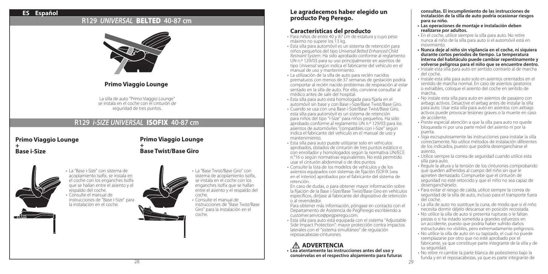 Descarga las instrucciones para tu Asiento de coche en formato PDF gratis! Encuentra tus instrucciones Primo Viaggio Lounge - PEG PEREGO y toma tu dispositivo electrónico nuevamente en la mano. En esta página están publicados todos los documentos necesarios para el uso de su dispositivo. Primo Viaggio Lounge de la marca PEG PEREGO.