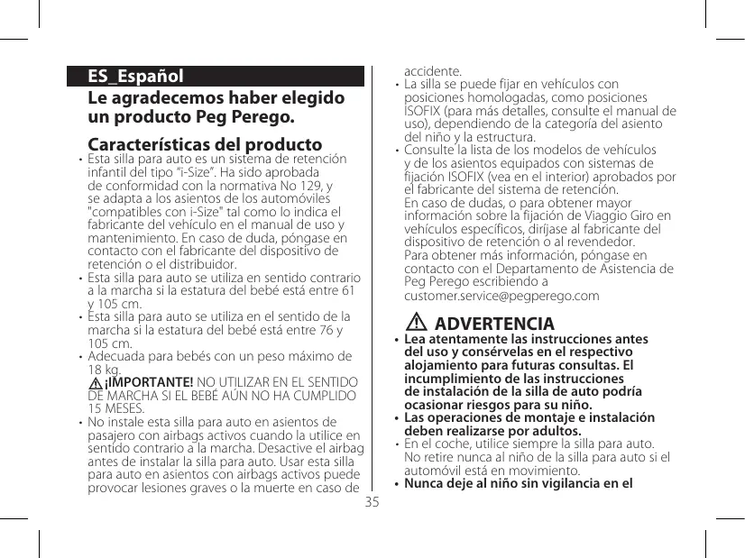 Descarga las instrucciones para tu Asiento de coche en formato PDF gratis! Encuentra tus instrucciones Viaggio Giro - PEG PEREGO y toma tu dispositivo electrónico nuevamente en la mano. En esta página están publicados todos los documentos necesarios para el uso de su dispositivo. Viaggio Giro de la marca PEG PEREGO.