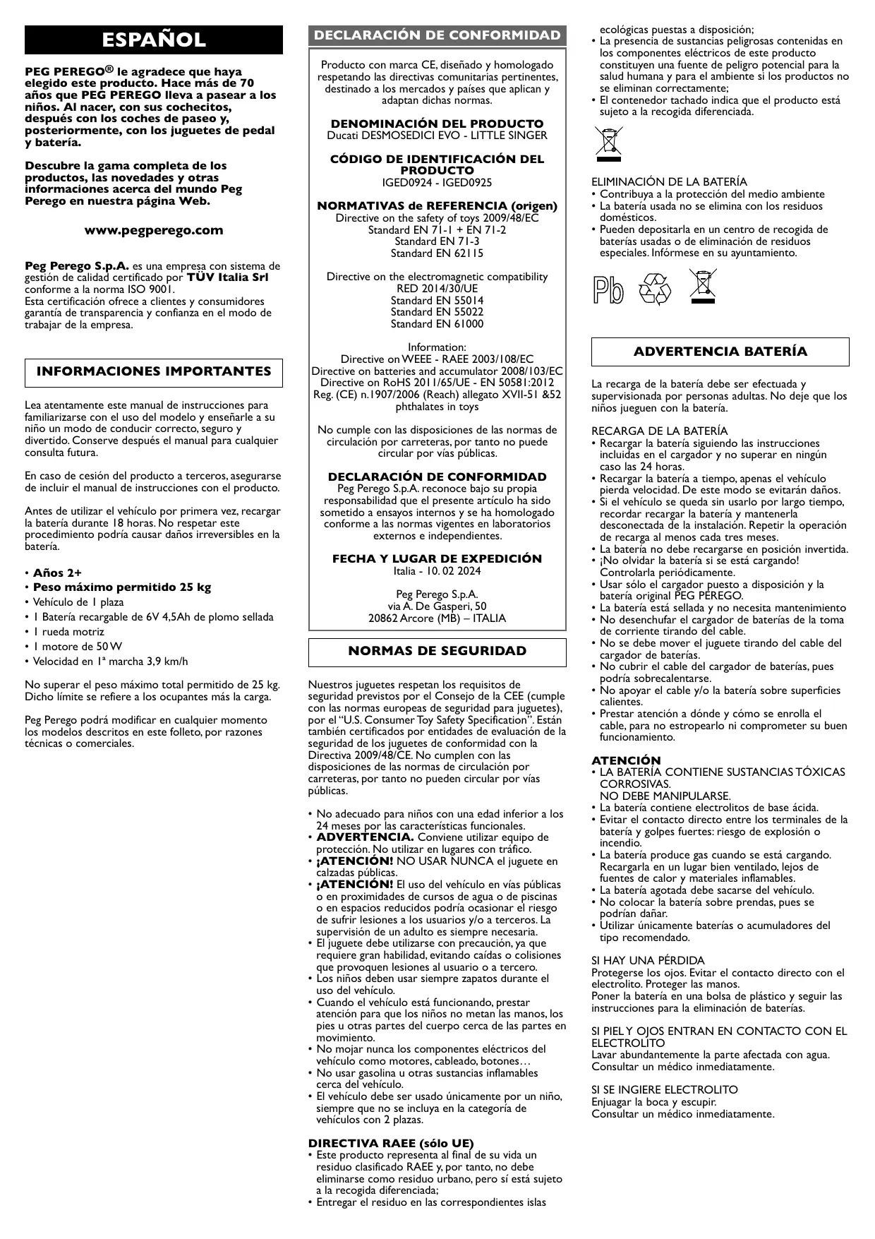 Encuentra gratis el manual del aparato Ducati Mini Evo PEG PEREGO en formato PDF.