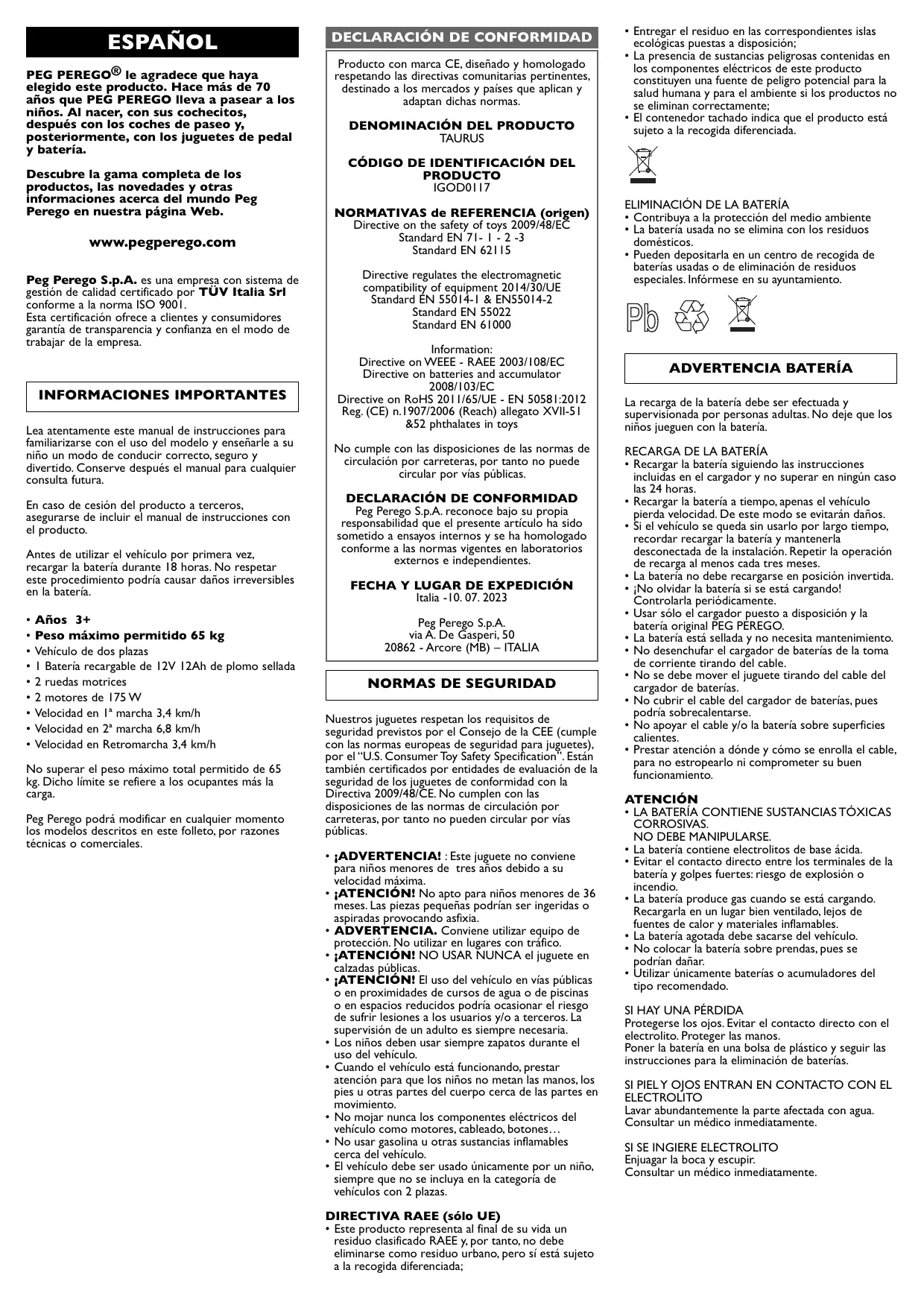 Encuentra gratis el manual del aparato Taurus PEG PEREGO en formato PDF.