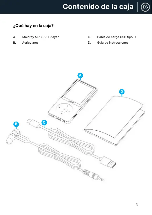 À. Majority MP3 PRO Player C. Câble de charge USB Type-C B. Ecouteurs D. Guide d'instructions