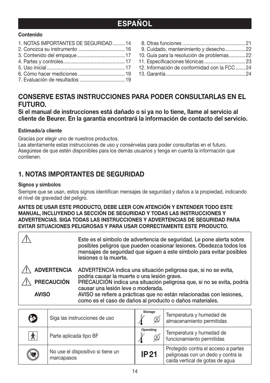 + Les réparations doivent uniquement être effectuées par le service clientèle de Beurer.