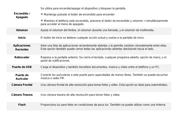 Prueba de Agua Elteléfono mévil no es impermeable. Manténgalo alejado de agua 0 liquidos para evitar daño Liamadas de Emergencia SOS Asegürese de que su disposiivo esté encendido y en un rea de servicio. En la pantalla de inicio, pulse la tecla del eléfono y marque el nümero de emergencia. Uso de bateria Para mejorar el rendimiento y la vida ütl de la bateria, se recomienda que cargue la bateria completamente antes de utlzar el teléfono môvil por primera vez y que inicialmente se complete dos o tres ciclos de carga completos.
