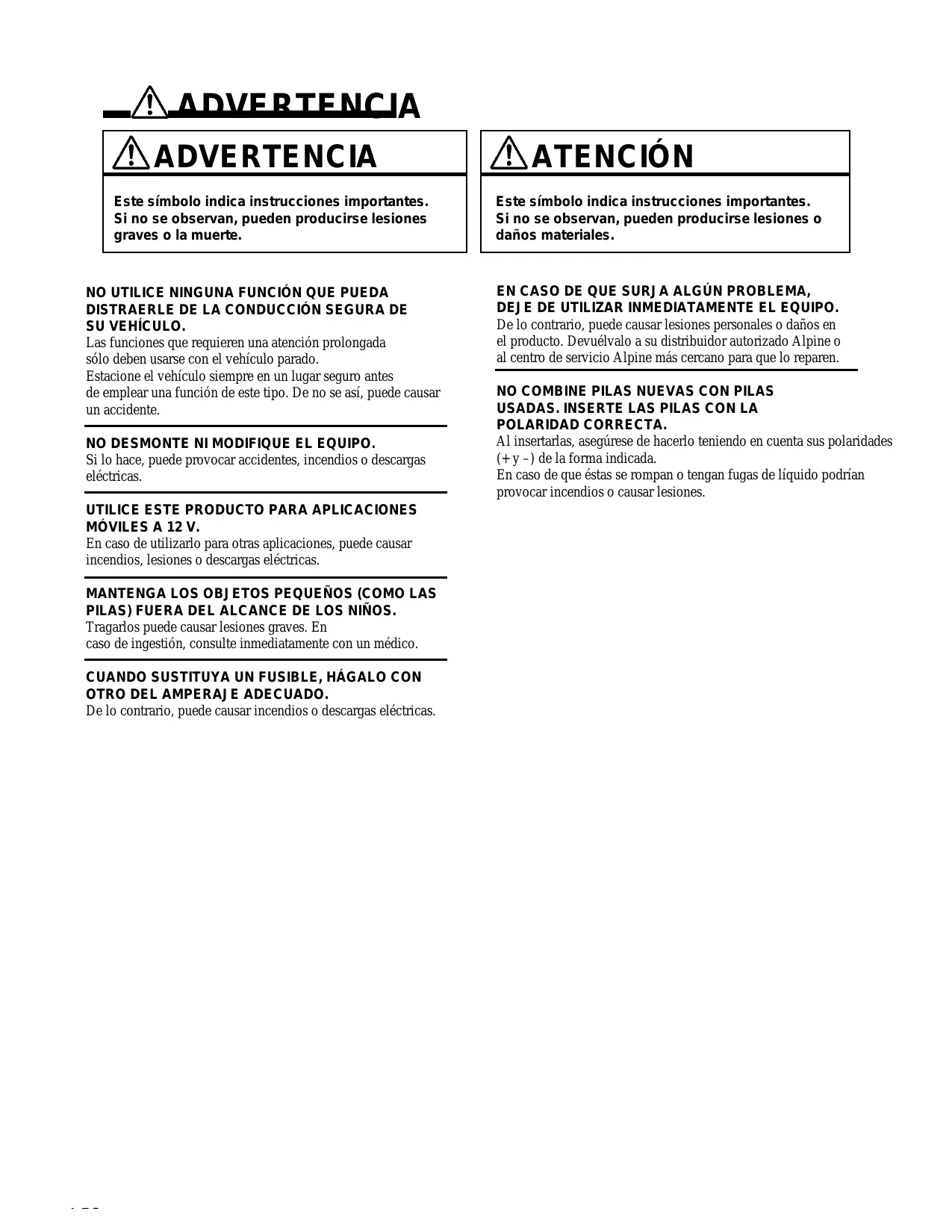 MÓVILES A 12 V. En caso de utilizarlo para otras aplicaciones, puede causar incendios, lesiones o descargas eléctricas. MANTENGA LOS OBJETOS PEQUEÑOS (COMO LAS PILAS) FUERA DEL ALCANCE DE LOS NIÑOS. Tragarlos puede causar lesiones graves. En caso de ingestión, consulte inmediatamente con un médico. CUANDO SUSTITUYA UN FUSIBLE, HÁGALO CON OTRO DEL AMPERAJE ADECUADO. De lo contrario, puede causar incendios o descargas eléctricas. 4-ES ATENCIÓN Este símbolo indica instrucciones importantes. Si no se observan, pueden producirse lesiones o daños materiales. EN CASO DE QUE SURJA ALGÚN PROBLEMA, DEJE DE UTILIZAR INMEDIATAMENTE EL EQUIPO. De lo contrario, puede causar lesiones personales o daños en el producto. Devuélvalo a su distribuidor autorizado Alpine o al centro de servicio Alpine más cercano para que lo reparen.