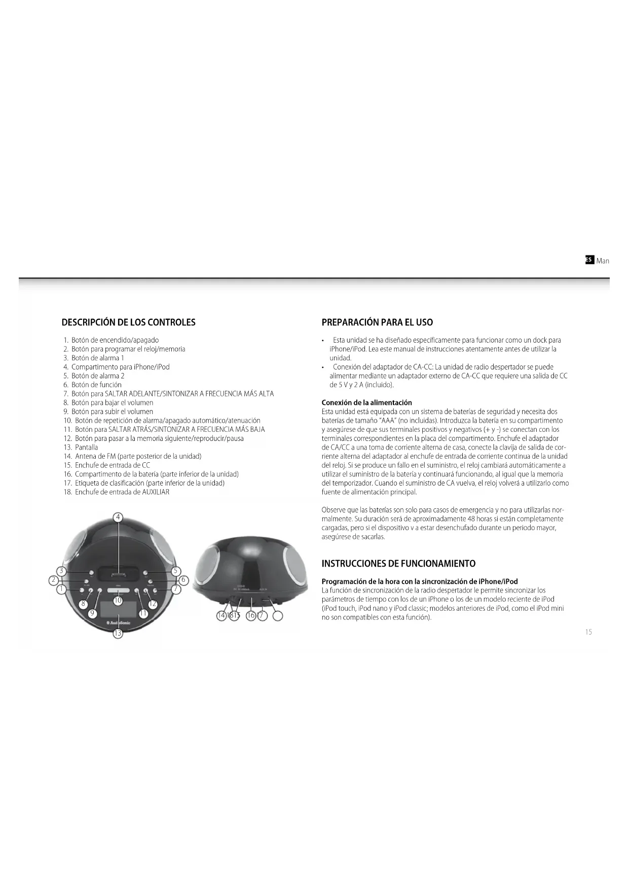 Programación de la hora con la sincronización de iPhone/iPod La función de sincronización de la radio despertador le permite sincronizar los parámetros de tiempo con los de un iPhone o los de un modelo reciente de iPod (iPod touch, iPod nano y iPod classic; modelos anteriores de iPod, como el iPod mini no son compatibles con esta función).16 Manual de instrucciones