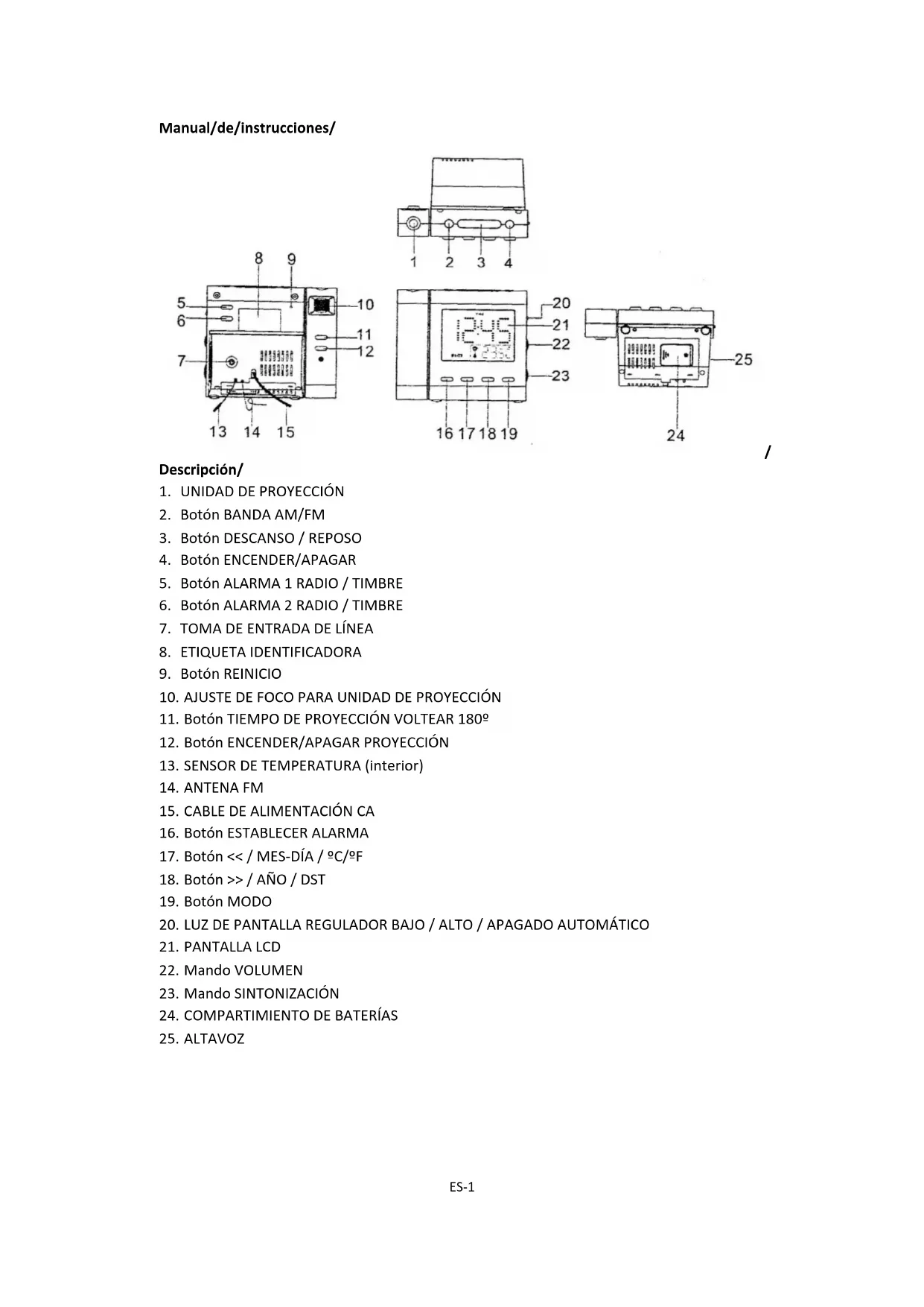 Conexión de corriente Conecte el CABLE DE ALIMENTACIÓN (15) a una toma de corriente CA. Esta unidad está equipada con un sistema de reserva de batería, que requiere una batería de litio CR2032 (plana) de 3V (no incluida). Introduzca la batería en el COMPARTIMENTO DE LA BATERÍA (24), asegurándose de que los terminales positivo y negativo (+ y -) de la batería se correspondan con los terminales indicados en la placa del compartimento. Si se produce un fallo de corriente, el reloj pasa automáticamente a alimentarse con la toma de corriente de la batería, de manera que el reloj y la memoria del temporizador siguen contando. Cuando se reanuda la corriente, el reloj vuelve a alimentarse con la corriente de CA. Configuración de la hora, el calendario y la alarma A. Configuración de la hora y el calendario Pulse el botón MODO (19) en modo normal y manténgalo pulsado durante más de 2 segundos para acceder al modo de configuración de hora. Seguidamente, pulse el botón MODE (19) para cambiar el ciclo de modo, como se indica a continuación: Modo normal Año Mes Día 12/24 H Hora RTC Min. RTC Modo normal Acción (durante el ajuste de la fecha): - Pulse el botón << / MES-DÍA / ºC/ºF (17) para ajustar los datos hacia atrás. - Pulse el botón >> / AÑO / DST (18) para ajustar los datos hacia adelante. - Mantenga pulsado << / MES-DÍA / ºC/ºF (17) o >> / AÑO / DST (18) durante 2 segundos para activar el retroceso/avance automático. B. Configuración de la alarma 1 y la alarma 2 Pulse el botón CONFIGURACIÓN DE ALARMA (16) en modo normal y manténgalo pulsado durante más de 2 segundos para acceder al modo de configuración de alarma. Seguidamente, pulse el botón CONFIGURACIÓN DE ALARMA (16) para cambiar el ciclo de modo, como se indica a continuación: Modo normal Hora AL.1 Min. AL.1 Alarma días de diario AL.1 Hora AL.2 Min. AL.2 Alarma días de diario AL.2 Modo normal Seleccione el modo de alarma en días de diario como se indica a continuación 1-5 De lunes a viernes 1-7 Toda la semana 6-7 Sábado y domingo 1-1 Un día de la semana Acción (durante el ajuste de la fecha): - Pulse el botón << / MES-DÍA / ºC/ºF (17) para ajustar los datos hacia atrás. - Pulse el botón >>/ AÑO / DST (18) para ajustar los datos hacia adelante. - Mantenga pulsado << / MES-DÍA / ºC/ºF (17) o >> / AÑO / DST (18) durante 2 segundos para activar el retroceso/avance automático.ES-3 Configuración de la salida de alarma y activar/desactivar la alarma - Pulse el botón ALARMA 1 RADIO/TIMBRE (5) / ALARMA 2 RADIO / TIMBRE (6) a posición música para seleccionar despertar con la radio, y a timbre para seleccionar despertar con timbre; ponga la posición de alarma desactivada para desactivar la alarma. - Ponga el interruptor LUZ DE PANTALLA REGULADOR BAJO / ALTO / APAGADO AUTOMÁTICO (20) en posición APAGADO AUTOMÁTICO (la pantalla se apagará automáticamente en 15 segundos). Cuando suene la alarma, la pantalla se encenderá automáticamente de nuevo. Duración de la alarma y función de repetición de alarma A. Duración de la alarma La alarma por Zumbador o Radio seguirá sonando durante 30 minutos si no se pulsa ninguna tecla. Pasado ese tiempo, se detendrá automáticamente y volverá a sonar a la misma hora el día siguiente. B. Función de repetición de alarma - Cuando esté sonando la alarma, pulse el botón REPETICIÓN DE ALARMA / APAGADO AUTOMÁTICO (3) activará la función de repetición de alarma, y la alarma por zumbador o por radio se detendrá momentáneamente. - El intervalo de repetición de alarma es de 9 minutos - La repetición de alarma continuará a menos que se pulse el botón ENCENDER/APAGAR (4) para apagar la alarma por radio o zumbador. La alarma se detendrá automáticamente después de 30 minutos. - Ponga el interruptor REGULADOR DE LUZ DE PANTALLA BAJO / ALTO / APAGADO AUTOMÁTICO (20) en la posición REGULADOR DE LUZ DE PANTALLA BAJO / ALTO / APAGADO AUTOMÁTICO (la pantalla se apagará automáticamente en 15 segundos). Cuando la alarma suene, la pantalla se volverá a encender automáticamente. Pulse el botón REPETICIÓN DE ALARMA / APAGADO AUTOMÁTICO (3) para activar la función de repetición de alarma; la alarma se detendrá y se apagará la pantalla. Cambiar el contenido de la pantalla Pulse el botón << / MES-DÍA / ºC/ºF (17) para cambiar a mostrar el mes/día; pasados 5 segundos la pantalla volverá automáticamente a la hora. Pulse el botón >> / AÑO / DST (18) para cambiar a mostrar el año; pasados 5 segundos la pantalla volverá automáticamente a la hora. Función de apagado automático Al encender la radio, pulse el botón REPETICIÓN DE ALARMA / APAGADO AUTOMÁTICO (3) para activar el modo de apagado automático. La hora de apagado automático parpadeará durante 5 segundos; durante ese tiempo, pulse el botón REPETICIÓN DE ALARMA / APAGADO AUTOMÁTICO (3) de nuevo para cambiar la duración de 90 a 15 minutos. Pulse el botón ENCENDER / APAGAR (4) para desactivar esta función.ES-4 Atenuador de la luz de la pantalla Con la radio apagada, ponga el interruptor REGULADOR DE LUZ DE PANTALLA BAJO / ALTO / APAGADO AUTOMÁTICO (20) en el modo APAGADO AUTOMÁTICO; la pantalla LCD se apagará automáticamente en 15 segundos. - Pulse cualquier botón para encender la pantalla. DST – Horario de verano (verano e invierno) Pulse el botón >> / AÑO / DST (18) y manténgalo pulsado durante 3 para cambiar entre horario de verano y de invierno. Funcionamiento de la radio - Pulse el botón ENCENDER / APAGAR (4) para encender la radio. - Pulse el botón BANDA AM/FM (8) para elegir la longitud de onda deseada. - Seleccione la emisora mediante la rueda de SINTONIZACIÓN (23). - Gire la rueda de VOLUMEN (22) para ajustar el volumen a su gusto. - Pulse el botón ENCENDER/APAGAR (4) de nuevo para apagar la radio. Notas: - La banda AM utiliza una antena direccional interna. Gire la radio para obtener una mejor recepción. - Asegúrese de que la antena FM (14