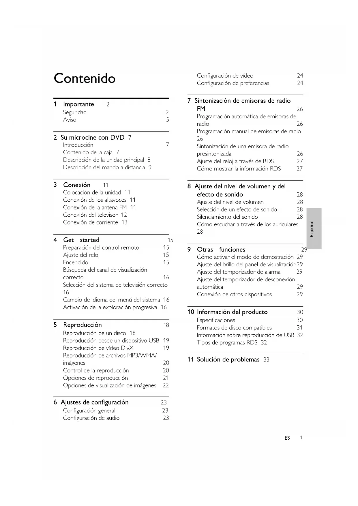 Contenido 1 Importante 2 Seguridad 2 Aviso 5 2 Su microcine con DVD 7 Introducción 7 Contenido de la caja 7 Descripción de la unidad principal 8 Descripción del mando a distancia 9 3 Conexión 11 Colocación de la unidad 11 Conexión de los altavoces 11 Conexión de la antena FM 11 Conexión del televisor 12 Conexión de corriente 13 4 Get started 15 Preparación del control remoto 15 Ajuste del reloj 15 Encendido 15 Búsqueda del canal de visualización correcto 16 Selección del sistema de televisión correcto