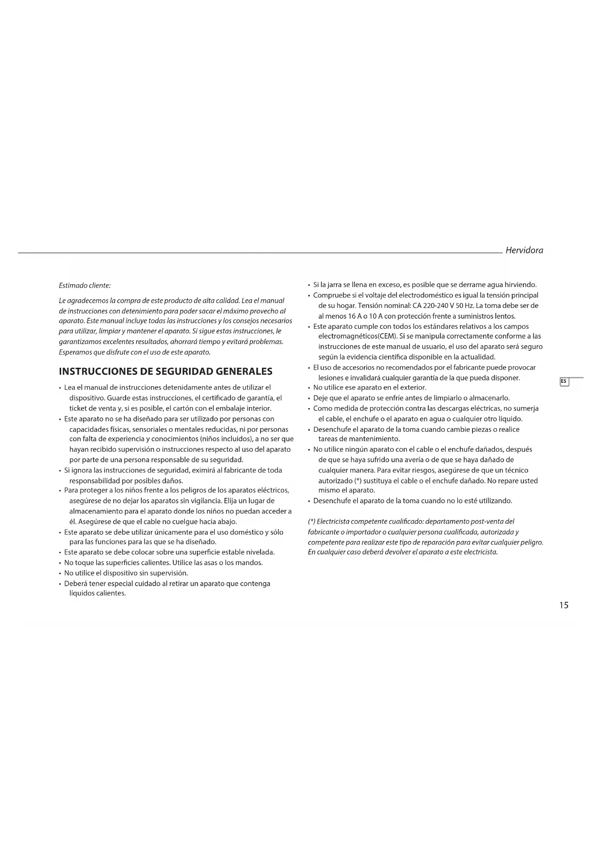 (*) Electricista competente cualicado: departamento post-venta del