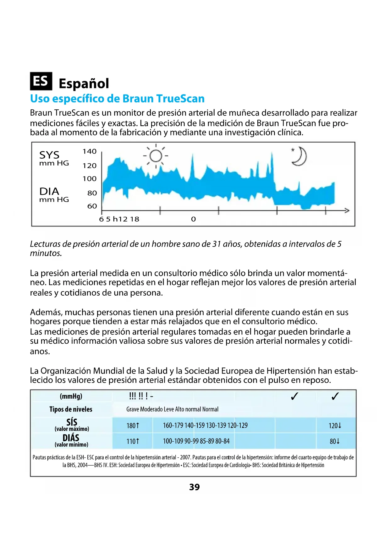 Dette produkt er i overensstemmelse med bestemmelserne fra EC-riektivet 93 /42 / EEC (Direktiv for medicinsk udstyr). Der skal tages specielle forbehold til ELEKTRONISK UDSTYR TIL MEDICINSK ANVENDEL- SE vedrørende EMC. Kontakt venligst et autoriseret kundeservicecenter i nærheden for yderligere detaljer om EMC-kravene (se garantibeviset). Garanti Se garantierklæringen inden i folderen fra Kaz Kundeservicecenter.39 Uso específico de Braun TrueScan Braun TrueScan es un monitor de presión arterial de muñeca desarrollado para realizar mediciones fáciles y exactas. La precisión de la medición de Braun TrueScan fue pro-bada al momento de la fabricación y mediante una investigación clínica. Lecturas de presión arterial de un hombre sano de 31 años, obtenidas a intervalos de 5 minutos.La presión arterial medida en un consultorio médico sólo brinda un valor momentá-neo. Las mediciones repetidas en el hogar reejan mejor los valores de presión arterial reales y cotidianos de una persona.Además, muchas personas tienen una presión arterial diferente cuando están en sus hogares porque tienden a estar más relajados que en el consultorio médico. Las mediciones de presión arterial regulares tomadas en el hogar pueden brindarle a su médico información valiosa sobre sus valores de presión arterial normales y cotidi-anos. La Organización Mundial de la Salud y la Sociedad Europea de Hipertensión han estab-lecido los valores de presión arterial estándar obtenidos con el pulso en reposo. (mmHg)