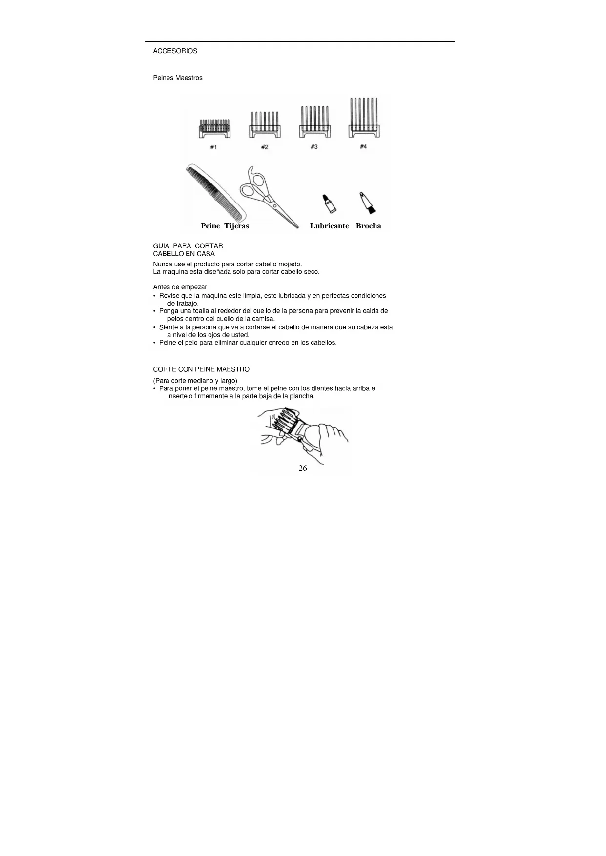 - Al empezar use el peine que deja el pelo mas largo y gradualmente use los otros peines si desea dejar el pelo más corto.