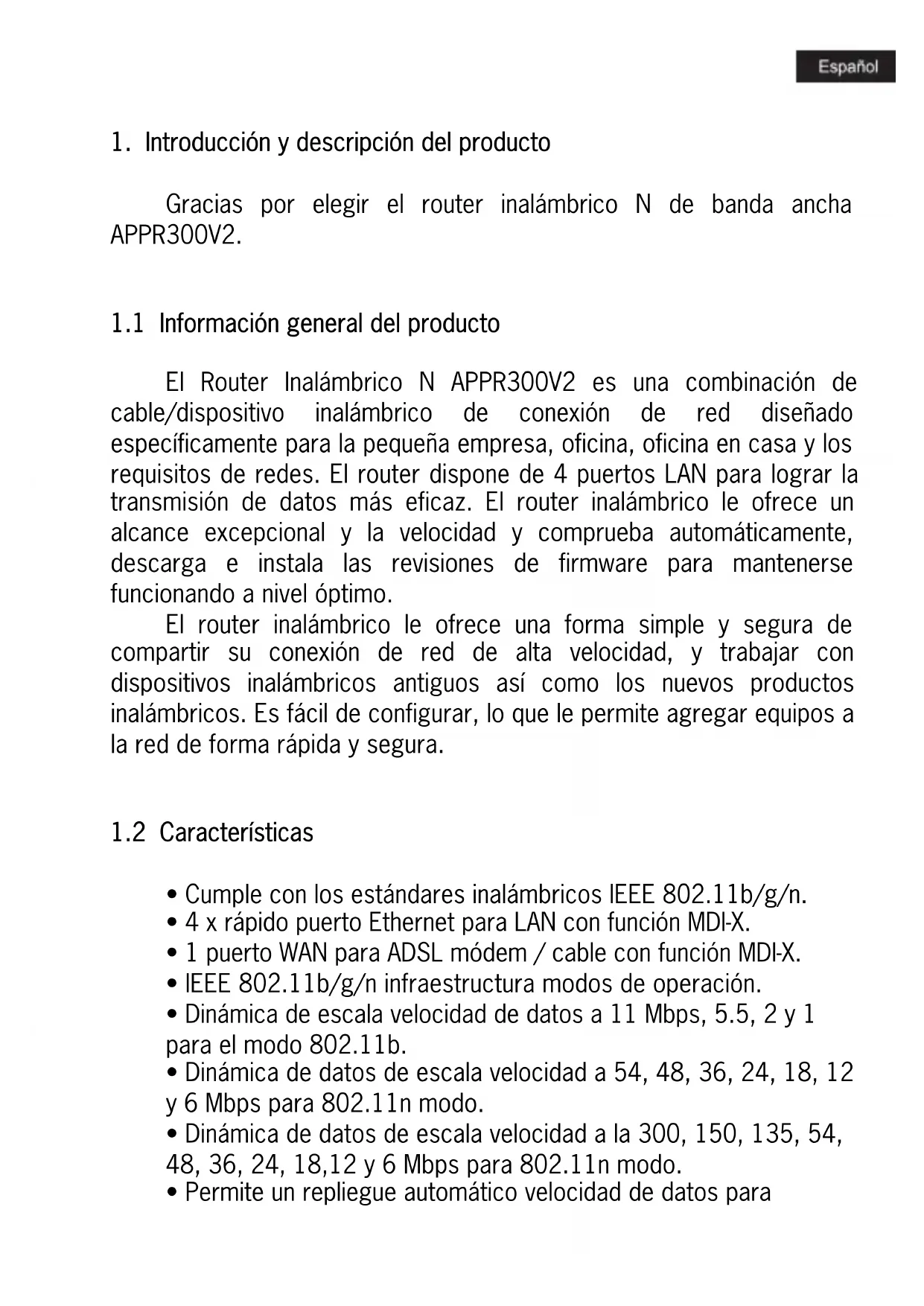 Ć Cumple con los estándares inalámbricos IEEE 802.11b/g/n. Ć 4 x rápido puerto Ethernet para LAN con función MDI-X. Ć 1 puerto WAN para ADSL módem / cable con función MDI-X. Ć IEEE 802.11b/g/n infraestructura modos de operación. Ć Dinámica de escala velocidad de datos a 11 Mbps, 5.5, 2 y 1 para el modo 802.11b. Ć Dinámica de datos de escala velocidad a 54, 48, 36, 24, 18, 12 y 6 Mbps para 802.11n modo. Ć Dinámica de datos de escala velocidad a la 300, 150, 135, 54, 48, 36, 24, 18,12 y 6 Mbps para 802.11n modo. Ć Permite un repliegue automático velocidad de datos paraaumentar la fiabilidad, rendimiento y alcance de transmisión. Ć Soporta encriptación de datos inalámbrica con estándar WEP de 64/128 bits para la seguridad. Ć Compatible con mejorar la seguridad de WPA-PSK, WPA2-PSK, WPA y WPA2. Ć basada en la Web herramientas de configuración y gestión vía navegador Web. Ć Soporta PPPoE/PPTP/L2TP protocolo para ADSL. Ć Soporta NAT para compartir una dirección IP a todos los usuarios de la red. Ć Soporta DHCP Servidor / Cliente. Ć Compatible con protección de firewall, asignación de servidor virtual, configuración de la aplicación especial. Ć Compatible con UPnP. Ć Compatible con la información estadística.