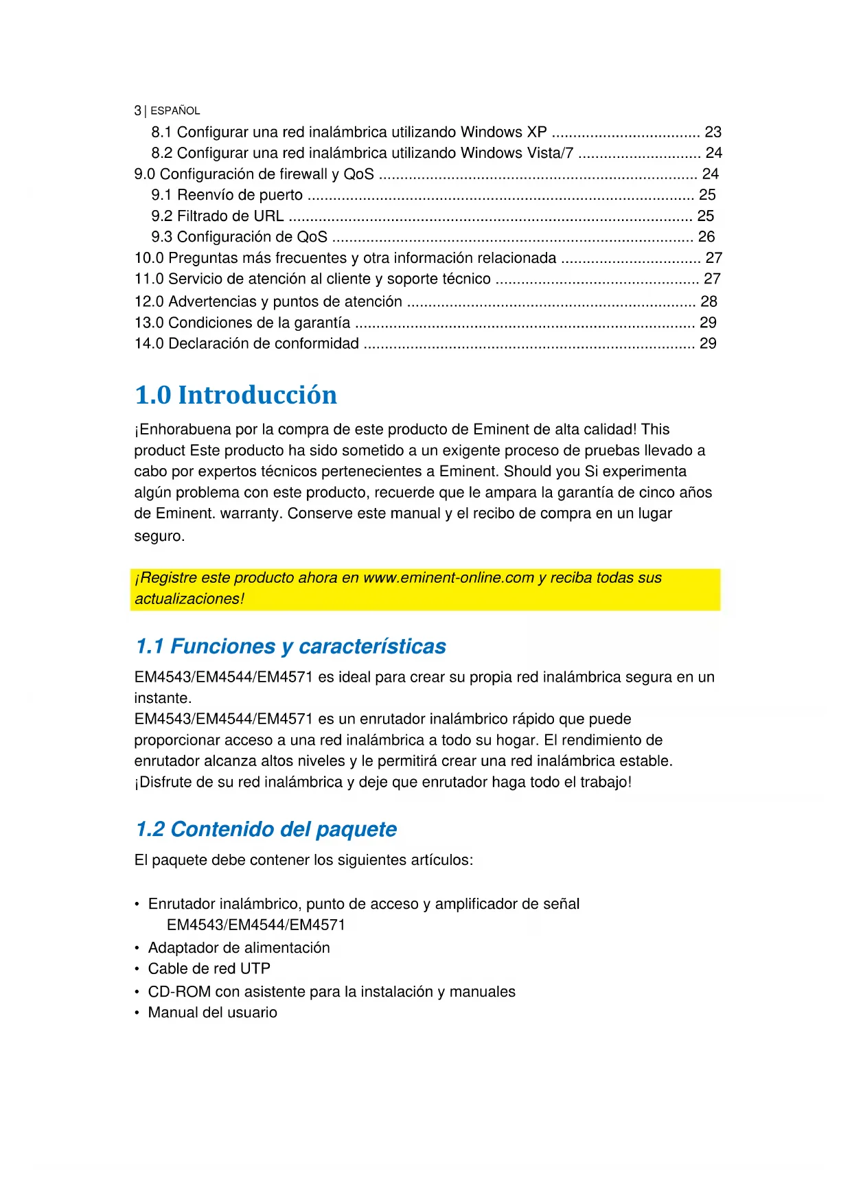 ESPAÑOL EM4543 / EM4544 / EM4571 - Enrutador inalámbrico, punto de acceso y amplificador de señal Contenidos 1.0 Introducción ........................................................................................................... 3