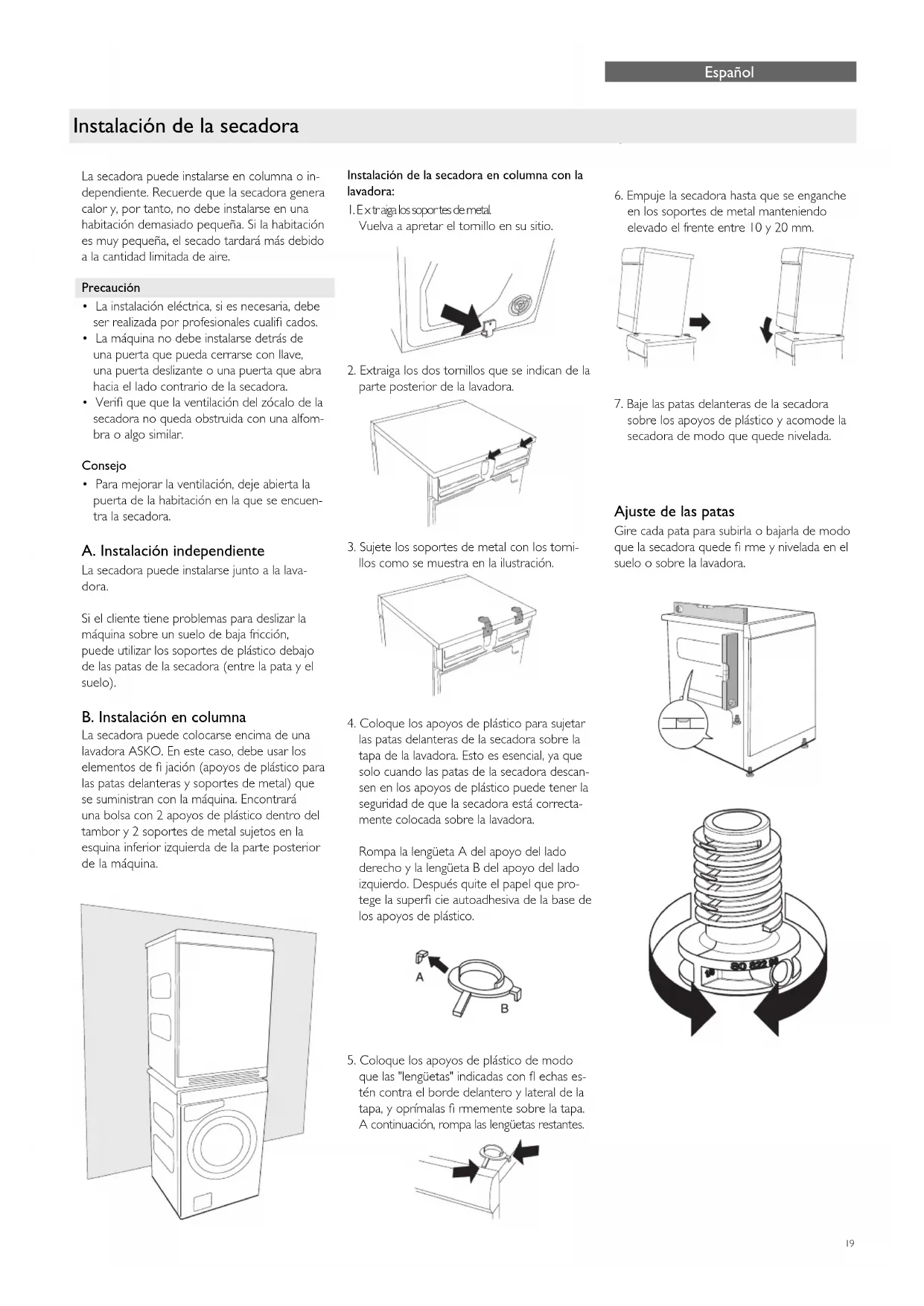 - Para mejorar la ventilación, deje abierta la puerta de la habitación en la que se encuen- tra la secadora. A. Instalación independiente La secadora puede instalarse junto a la lava- dora. Si el cliente tiene problemas para deslizar la máquina sobre un suelo de baja fricción, puede utilizar los soportes de plástico debajo de las patas de la secadora (entre la pata y el suelo). B. Instalación en columna La secadora puede colocarse encima de una lavadora ASKO. En este caso, debe usar los elementos de fi jación (apoyos de plástico para las patas delanteras y soportes de metal) que se suministran con la máquina. Encontrará una bolsa con 2 apoyos de plástico dentro del tambor y 2 soportes de metal sujetos en la esquina inferior izquierda de la parte posterior de la máquina. Ajuste de las patas Gire cada pata para subirla o bajarla de modo que la secadora quede fi rme y nivelada en el suelo o sobre la lavadora.