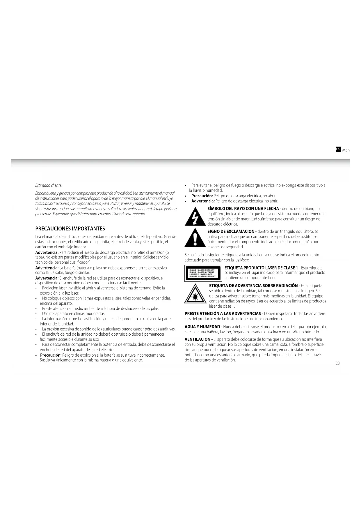 - Advertencia: Peligro de descarga eléctrica, no abrir. SÍMBOLO DEL RAYO CON UNA FLECHA - dentro de un triángulo equilátero, indica al usuario que la caja del sistema puede contener una tensión sin aislar de magnitud suficiente para constituir un riesgo de descarga eléctrica. SIGNO DE EXCLAMACION - dentro de un triángulo equilátero, se utiliza para indicar que un componente específico debe sustituirse únicamente por el componente indicado en la documentación por razones de seguridad. Se ha fijado la siguiente etiqueta a la unidad, en la que se indica el procedimiento adecuado para trabajar con la luz láser: ETIQUETA PRODUCTO LÁSER DE CLASE 1 - Esta etiqueta se incluye en el lugar indicado para informar que el producto contiene un componente láser. ETIQUETA DE ADVERTENCIA SOBRE RADIACIÓN - Esta etiqueta se ubica dentro de la unidad, tal como se muestra en la imagen. Se utiliza para advertir sobre tomar más medidas en la unidad. El equipo contiene radiación de rayos láser de acuerdo a los límites de productos láser de clase 1. PRESTE ATENCIÓN A LAS ADVERTENCIAS - Deben respetarse todas las adverten- cias del producto y de las instrucciones de funcionamiento. AGUA Y HUMEDAD - Nunca debe utilizarse el producto cerca del agua, por ejemplo, cerca de una bañera, lavabo, fregadero, lavadero, piscina o en un sótano húmedo. VENTILACIÓN - El aparato debe colocarse de forma que su ubicación no interfiera con su propia ventilación. No lo coloque sobre una cama, sofá, alfombra o superficie similar que puede bloquear sus aperturas de ventilación, en una instalación em- potrada, como una estantería o armario, que pueda impedir el flujo del aire a través de las aperturas de ventilación.