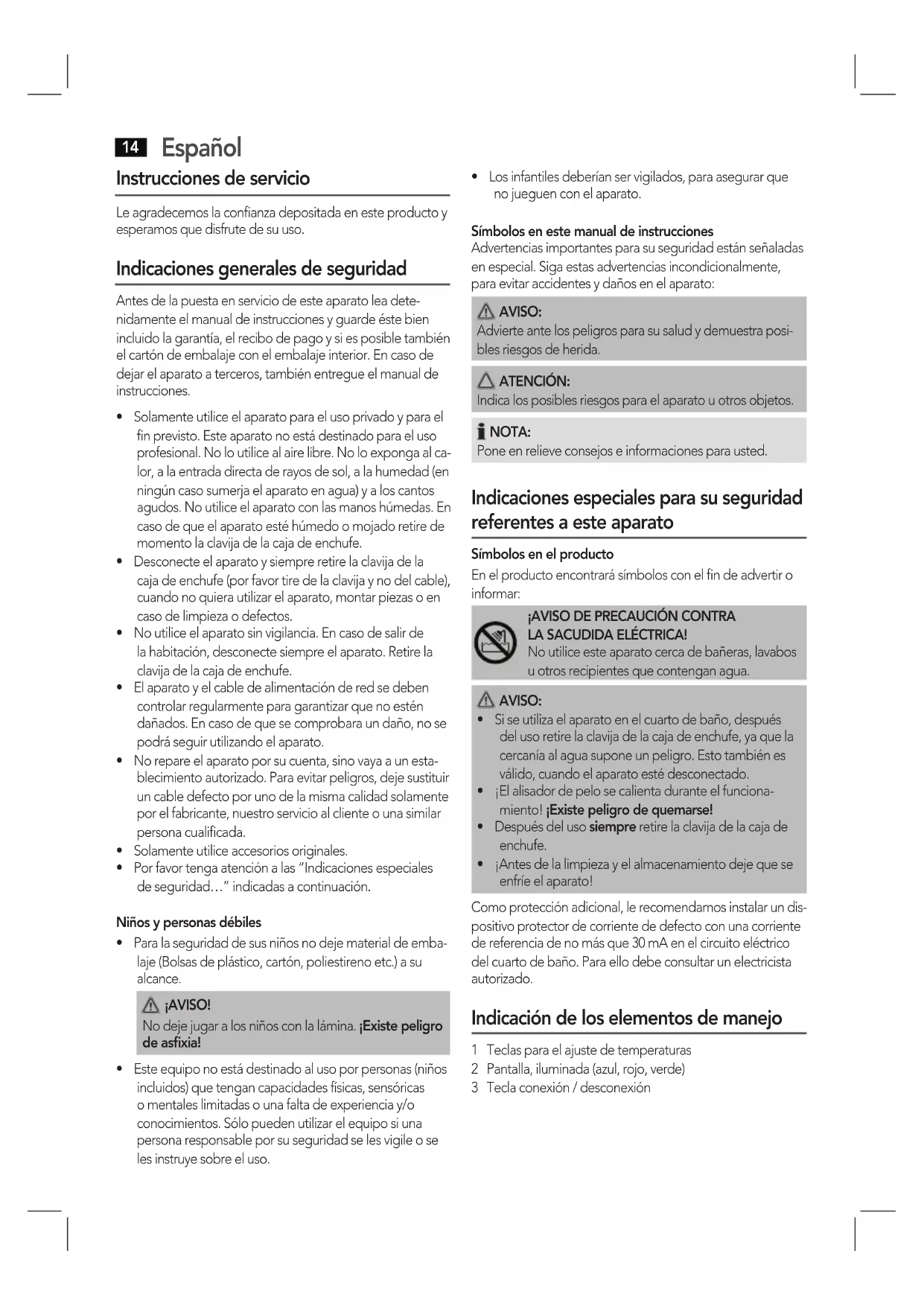 - Solamenteutiliceelaparatoparaelusoprivadoyparael fin previsto. Este aparato no está destinado para el uso profesional. No lo utilice al aire libre. No lo exponga al ca- lor, a la entrada directa de rayos de sol, a la humedad (en ningún caso sumerja el aparato en agua) y a los cantos agudos. No utilice el aparato con las manos húmedas. En caso de que el aparato esté húmedo o mojado retire de momento la clavija de la caja de enchufe.
