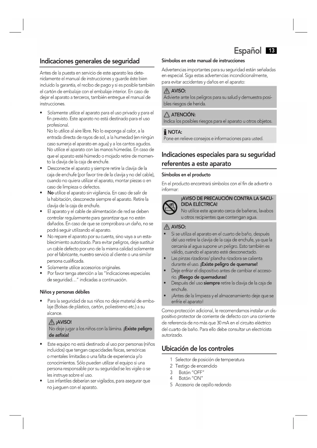 - ¡Antesdelalimpiezayelalmacenamientodejequese enfríe el aparato! Como protección adicional, le recomendamos instalar un dis- positivo protector de corriente de defecto con una corriente de referencia de no más que 30 mA en el circuito eléctrico del cuarto de baño. Para ello debe consultar un electricista autorizado. Ubicación de los controles 1 Selector de posición de temperatura 2 Testigo de encendido 3 Botón“OFF” 4 Botón“ON” 5 Accesorio de cepillo redondoEspañol