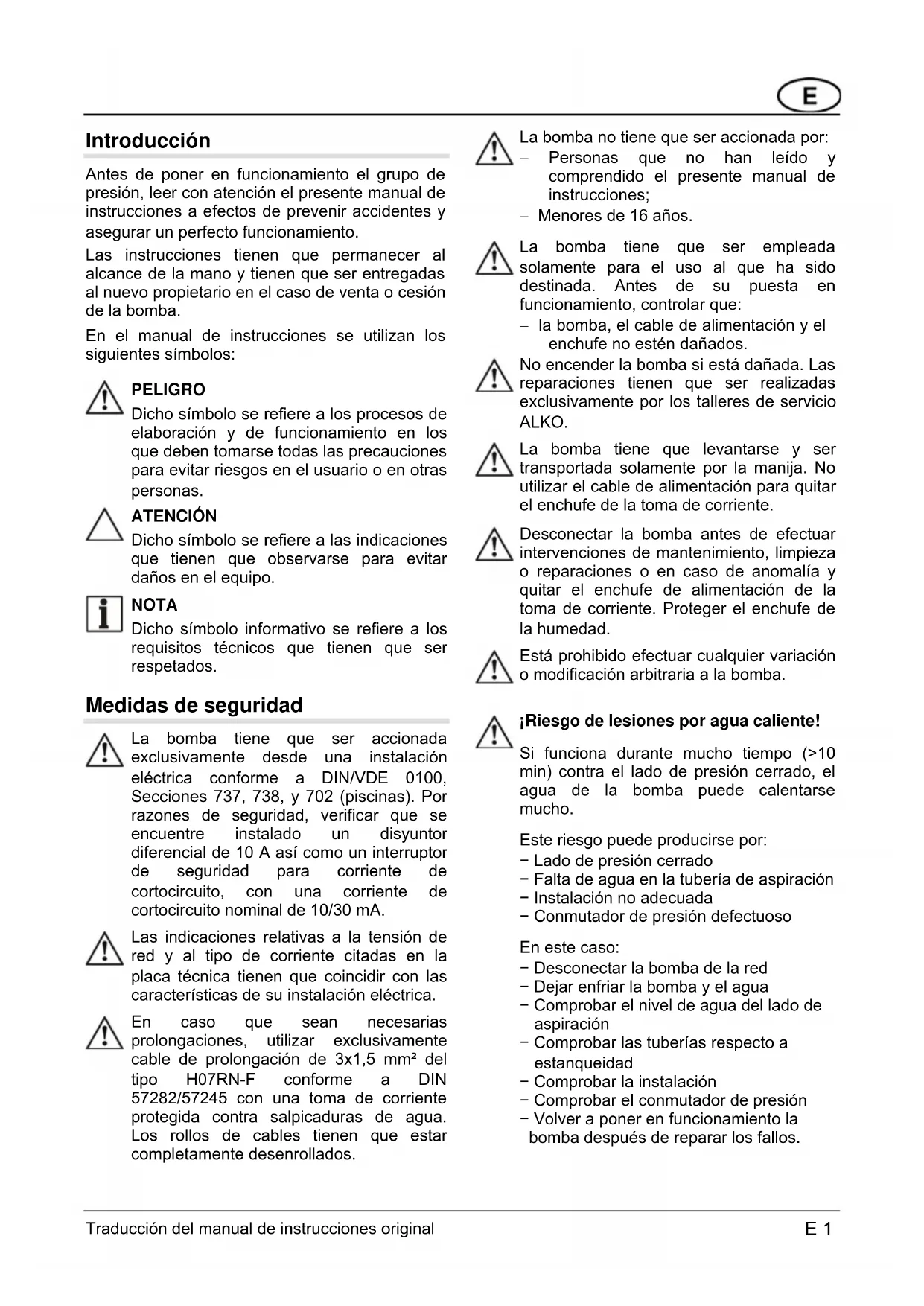 PELIGRO Dicho símbolo se refiere a los procesos de elaboración y de funcionamiento en los que deben tomarse todas las precauciones para evitar riesgos en el usuario o en otras personas. ATENCIÓN Dicho símbolo se refiere a las indicaciones que tienen que observarse para evitar daños en el equipo. NOTA Dicho símbolo informativo se refiere a los requisitos técnicos que tienen que ser respetados. Medidas de seguridad La bomba tiene que ser accionada exclusivamente desde una instalación eléctrica conforme a DIN/VDE 0100, Secciones 737, 738, y 702 (piscinas). Por razones de seguridad, verificar que se encuentre instalado un disyuntor diferencial de 10 A así como un interruptor de seguridad para corriente de cortocircuito, con una corriente de cortocircuito nominal de 10/30 mA. Las indicaciones relativas a la tensión de red y al tipo de corriente citadas en la placa técnica tienen que coincidir con las características de su instalación eléctrica. En caso que sean necesarias prolongaciones, utilizar exclusivamente cable de prolongación de 3x1,5 mm² del tipo H07RN-F conforme a DIN 57282/57245 con una toma de corriente protegida contra salpicaduras de agua. Los rollos de cables tienen que estar completamente desenrollados. La bomba no tiene que ser accionada por: − Personas que no han leído y comprendido el presente manual de instrucciones; − Menores de 16 años. La bomba tiene que ser empleada solamente para el uso al que ha sido destinada. Antes de su puesta en funcionamiento, controlar que: − la bomba, el cable de alimentación y el enchufe no estén dañados. No encender la bomba si está dañada. Las reparaciones tienen que ser realizadas exclusivamente por los talleres de servicio ALKO. La bomba tiene que levantarse y ser transportada solamente por la manija. No utilizar el cable de alimentación para quitar el enchufe de la toma de corriente. Desconectar la bomba antes de efectuar intervenciones de mantenimiento, limpieza o reparaciones o en caso de anomalía y quitar el enchufe de alimentación de la toma de corriente. Proteger el enchufe de la humedad. Está prohibido efectuar cualquier variación o modificación arbitraria a la bomba.