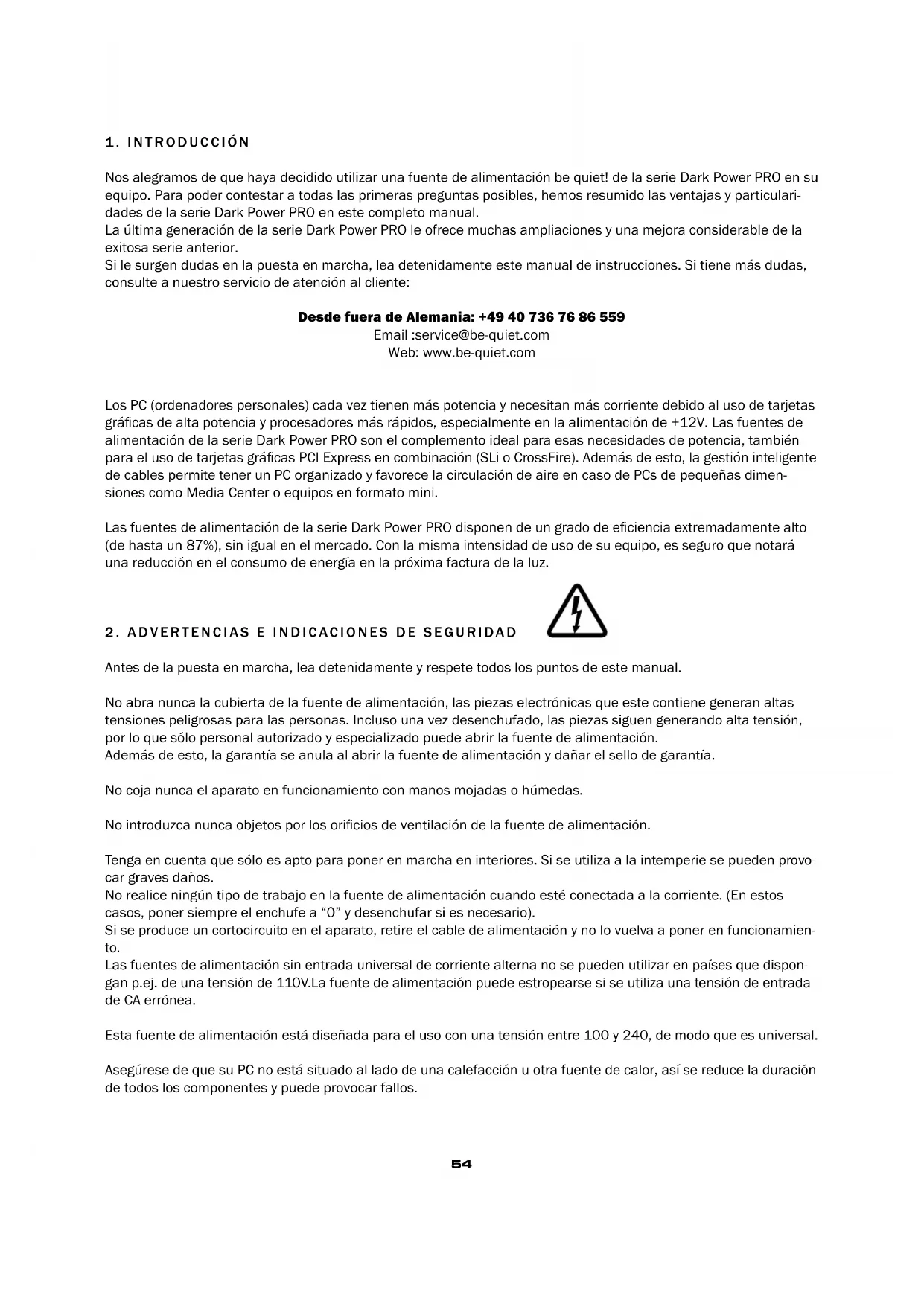 Nos alegramos de que haya decidido utilizar una fuente de alimentación be quiet! de la serie Dark Power PRO en su equipo. Para poder contestar a todas las primeras preguntas posibles, hemos resumido las ventajas y particulari dades de la serie Dark Power PRO en este completo manual. /D~OWLPDJHQHUDFLyQGHODVHULH'DUN3RZHU352OHRIUHFHPXFKDVDPSOLDFLRQHV\XQDPHMRUDFRQVLGHUDEOHGHOD exitosa serie anterior. Si le surgen dudas en la puesta en marcha, lea detenidamente este manual de instrucciones. Si tiene más dudas, consulte a nuestro servicio de atención al cliente: 'HVGHIXHUDGH$OHPDQLD (PDLOVHUYLFH#EHTXLHWFRP :HEZZZEHTXLHWFRP /RV3&RUGHQDGRUHVSHUVRQDOHVFDGDYH]WLHQHQPiVSRWHQFLD\QHFHVLWDQPiVFRUULHQWHGHELGRDOXVRGHWDUMHWDV JUiÀFDVGHDOWDSRWHQFLD\SURFHVDGRUHVPiVUiSLGRVHVSHFLDOPHQWHHQODDOLPHQWDFLyQGH9/DVIXHQWHVGH alimentación de la serie Dark Power PRO son el complemento ideal para esas necesidades de potencia, también SDUDHOXVRGHWDUMHWDVJUiÀFDV3&,([SUHVVHQFRPELQDFLyQ6/LR&URVV)LUH$GHPiVGHHVWRODJHVWLyQLQWHOLJHQWH de cables permite tener un PC organizado y favorece la circulación de aire en caso de PCs de pequeñas dimen