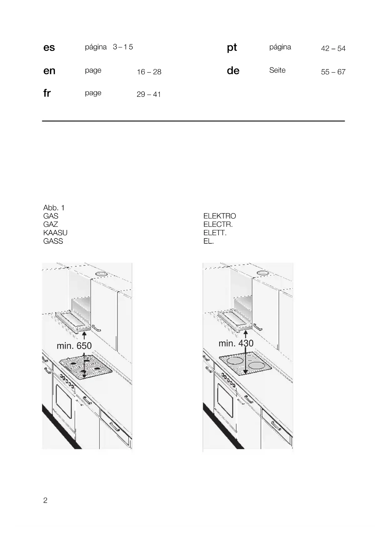 Seite 55 – 67 Abb. 1 ELEKTRO ELECTR. ELETT. EL. Abb. 1 GAS GAZ KAASU GASS min. 650 min. 430Descripción del aparato Modalidades de funcionamiento Evacuación del aire hacia el exterior: ❑ El ventilador que incorpora la campana extractora aspira los vahos de la cocina y los evacúa hacia el exterior, haciéndo- los pasar previamente a través del filtro antigrasa. ❑ El filtro antigrasa absorbe las partículas sólidas contenidas en los vahos de la cocina. ❑ La cocina queda así prácticamente libre de grasa y olores.