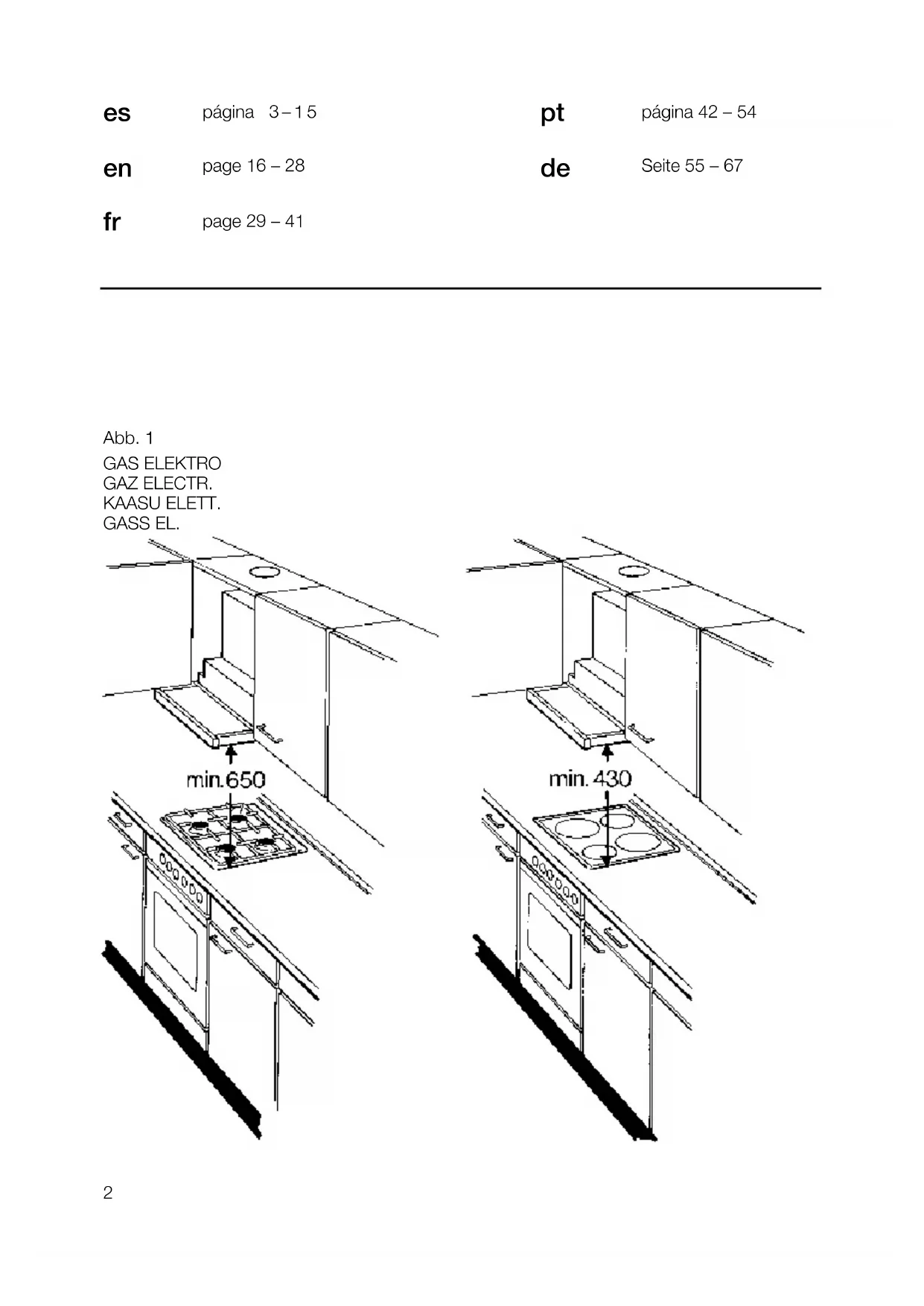 Seite 55 – 67 Abb. 1 GAS ELEKTRO GAZ ELECTR. KAASU ELETT. GASS EL.Modalidades de funcionamiento Para ello, es necesario que existan aperturas no bloqueables por las que el aire de combustión pueda renovarse y ventilarse sin dificultad, por ejemplo por puertas, ventanas o cajas murales para la alimentación o evacuación del aire o también pueden tomarse otras otras medidas como por ejemplo instalando cerrojos invertidos o similares. Cerciorarse de que existe una alimenta- ción suficiente del aire. De lo contrario el aire evacuado se vuelve a utilizar para la admisión y se corre el peligro de intoxicación. La sola presencia de una caja mural para ali- mentación o evacuación del aire, sin embar- go, no constituye una garantía para la obser- vación de los límites de tolerancia válidos. Nota: En las consideraciones y valoraciones a este respecto siempre habrá que tener en cuenta todo el conjunto del sistema de ventilación existente en la vivienda. Esta regla no es válida para las cocinas y placas de cocción de gas. Las campanas extractoras montadas con evacuación del aire interior (sistema de recir- culación del aire), dotadas de filtro de carbón activo, pueden funcionar sin ningún tipo de restricción. Evacuación del aire hacia el interior (sistema de recirculación del aire): ❑ Para trabajar con esta modalidad hay que montar un filtro de carbón activo en la campana extractora (véase el capítulo «Filtros y mantenimiento» de las presentes Instrucciones). El kit de montaje completo, así como los filtros de repuesto, se pueden adquirir en el comercio especializado. ❑ El ventilador que incorpora la campana extractora aspira los vahos de la cocina y los hace pasar a través de los filtros anti- grasa y de carbón activo, devolviéndolos a continuación, una vez purificados, a la cocina. ❑ El filtro antigrasa absorbe las partículas sólidas contenidas en los vahos de la cocina. ❑ El filtro de carbón activo absorbe el olor. En caso de no montar la campana un fil- tro de carbón activo, no se pueden absorber los olores producidos durante la preparación de los alimentos. Interruptor Iluminación/ Ventilador Cajón de filtro extraíble Descripción del aparato Instrucciones para el uso: Modalidades de funcionamiento Evacuación del aire hacia el exterior: ❑ El ventilador que incorpora la campana extractora aspira los vahos de la cocina y los evacúa hacia el exterior, haciéndolos pasar previamente a través del filtro antigrasa. ❑ El filtro antigrasa absorbe las partículas sólidas contenidas en los vahos de la cocina. ❑ La cocina queda así prácticamente libre de grasa y olores.