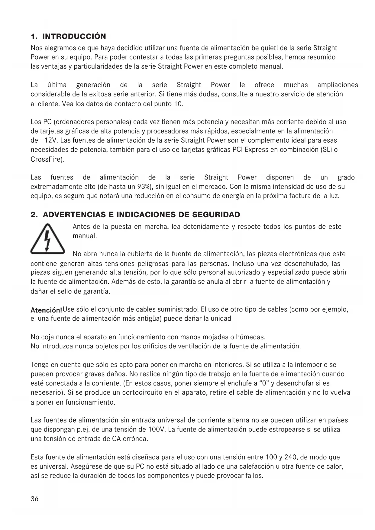 Nosalegramosdequehayadecididoutilizarunafuentedealimentaciónbequiet!delaserieStraight Powerensuequipo.Parapodercontestaratodaslasprimeraspreguntasposibles,hemosresumido lasventajasyparticularidadesdelaserieStraightPowerenestecompletomanual. La última generación de la serie Straight Power le ofrece muchas ampliaciones y una mejora considerabledelaexitosaserieanterior.Sitienemásdudas,consulteanuestroserviciodeatención al cliente. Vea los datos de contacto del punto 10. LosPC(ordenadorespersonales)cadaveztienenmáspotenciaynecesitanmáscorrientedebidoaluso detarjetasgrácasdealtapotenciayprocesadoresmásrápidos,especialmenteenlaalimentación de+12V.LasfuentesdealimentacióndelaserieStraightPowersonelcomplementoidealparaesas necesidadesdepotencia,tambiénparaelusodetarjetasgrácasPCIExpressencombinación(SLio CrossFire). Las fuentes de alimentación de la serie Straight Power disponen de un grado de eciencia extremadamentealto(dehastaun93%),sinigualenelmercado.Conlamismaintensidaddeusodesu equipo,esseguroquenotaráunareducciónenelconsumodeenergíaenlapróximafacturadelaluz.