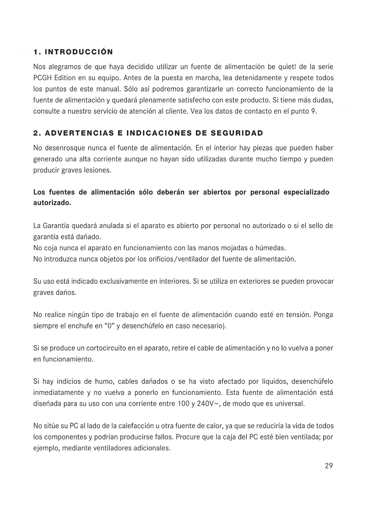 Nos alegramos de que haya decide利用率 un fuente de alimentacion be quiet! de la series PCGH Edition en su equipo. Antes de la puesta en marcha, lea detenidamente y respete todos los+puntos de este manual. Sólo asi podremos garantizarle un correcto funcionaimiento de la fuente de alimentacion y quedaráplenamente satisfecho con este producto. Si tiene más dudas, consulte a nuestro service de atencion al cliente. Vea los datos de contacto en el punto 9.