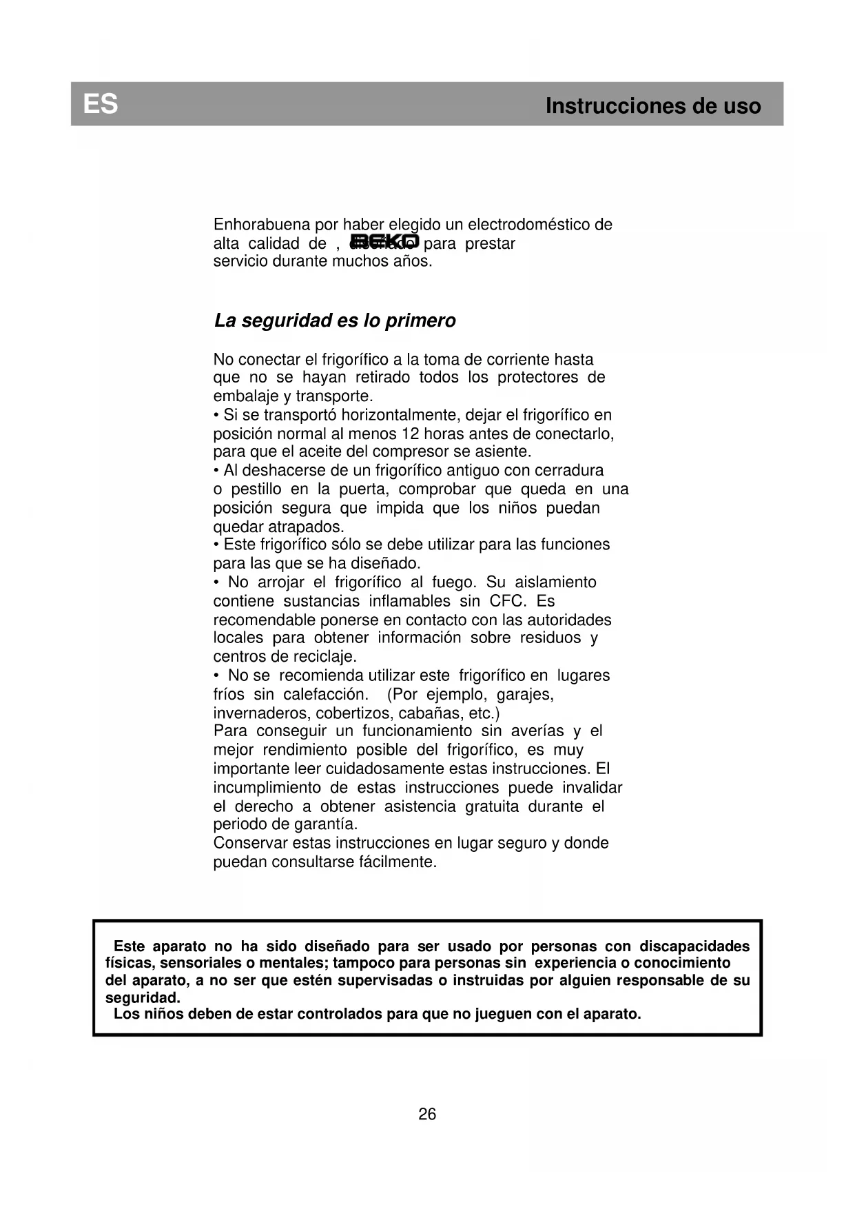 La seguridad es lo primero /26 Requisitos eléctricos /27 Instrucciones de transporte /27 Instrucciones de instalación /27 Detalles del frigorífico /28 Disposición recomendada de los alimentos en el frigorífico /28 Control y ajuste de la temperatura /28 Antes del uso /29 Almacenamiento de alimentos congelados /29 Congelación de alimentos frescos /30 Cubitos de hielo /30 Desescarchado /30 Sustitución de la bombilla interior /31 Conservación y limpieza /31 Reposicionamiento de la puerta /31 Prácticas correctas e incorrectas /32 Resolución de problemas /33 Consumo energetic /33