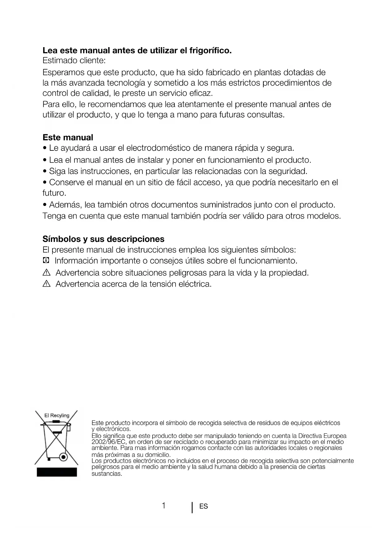 Lea este manual antes de utilizar el frigorífico.
