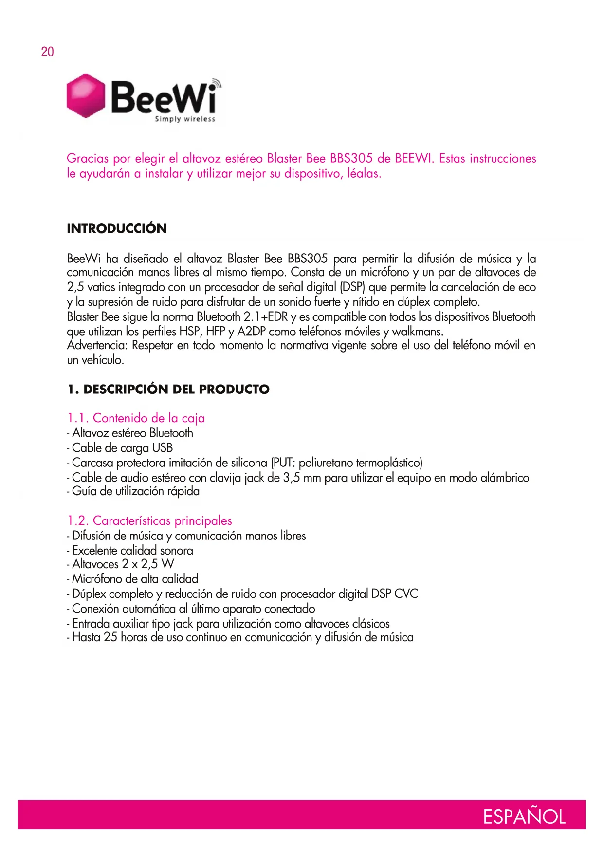 1.1. Contenido de la caja - Altavoz estéreo Bluetooth - Cable de carga USB - Carcasa protectora imitación de silicona (PUT: poliuretano termoplástico) - Cable de audio estéreo con clavija jack de 3,5 mm para utilizar el equipo en modo alámbrico - Guía de utilización rápida 1.2. Características principales - Difusión de música y comunicación manos libres - Excelente calidad sonora - Altavoces 2 x 2,5 W - Micrófono de alta calidad - Dúplex completo y reducción de ruido con procesador digital DSP CVC - Conexión automática al último aparato conectado - Entrada auxiliar tipo jack para utilización como altavoces clásicos - Hasta 25 horas de uso continuo en comunicación y difusión de música Gracias por elegir el altavoz estéreo Blaster Bee BBS305 de BEEWI. Estas instrucciones le ayudarán a instalar y utilizar mejor su dispositivo, léalas. ESPAÑOL21 1.3. Presentación del producto On/Off: Interruptor de encendido/apagado Conector de carga (compatible con micro USB) Conector jack de 3,5 mm: Entrada jack auxiliar Tecla multifunción, reproducción y pausa de la música, responder una llamada, modo de emparejamiento Indicador luminoso Tecla de control de pistas & Tecla de control de volumen VOL /VOL Micrófono 1.4. Características del producto