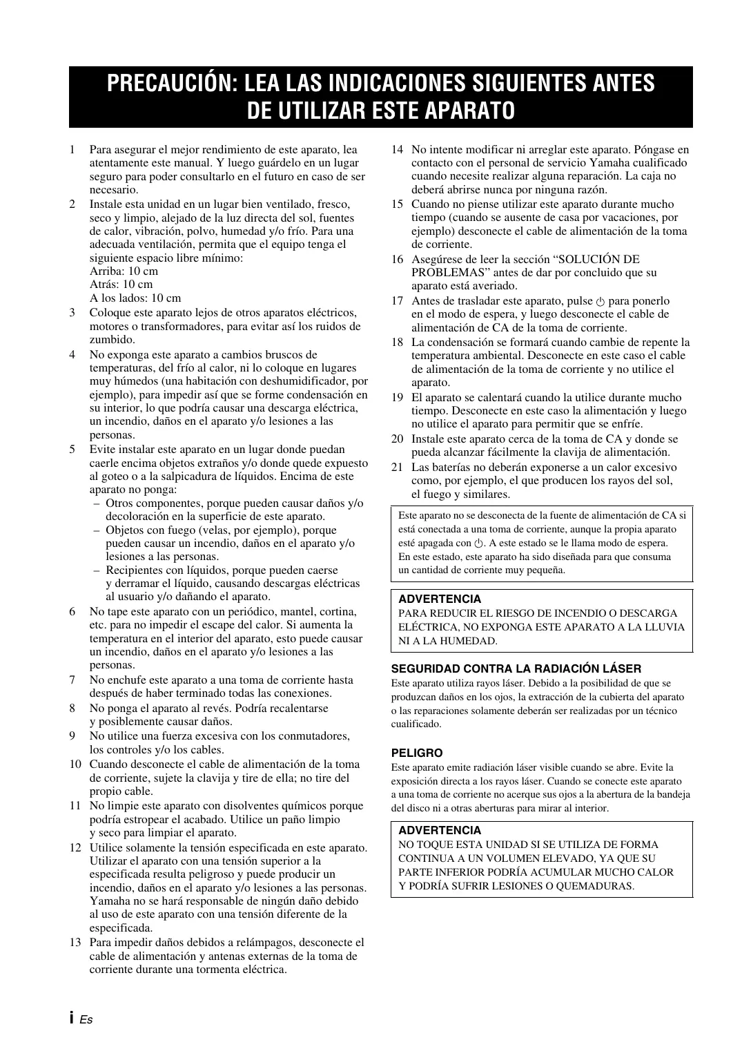14 No intente modificar ni arreglar este aparato. Póngase en contacto con el personal de servicio Yamaha cualificado cuando necesite realizar alguna reparación. La caja no deberá abrirse nunca por ninguna razón.