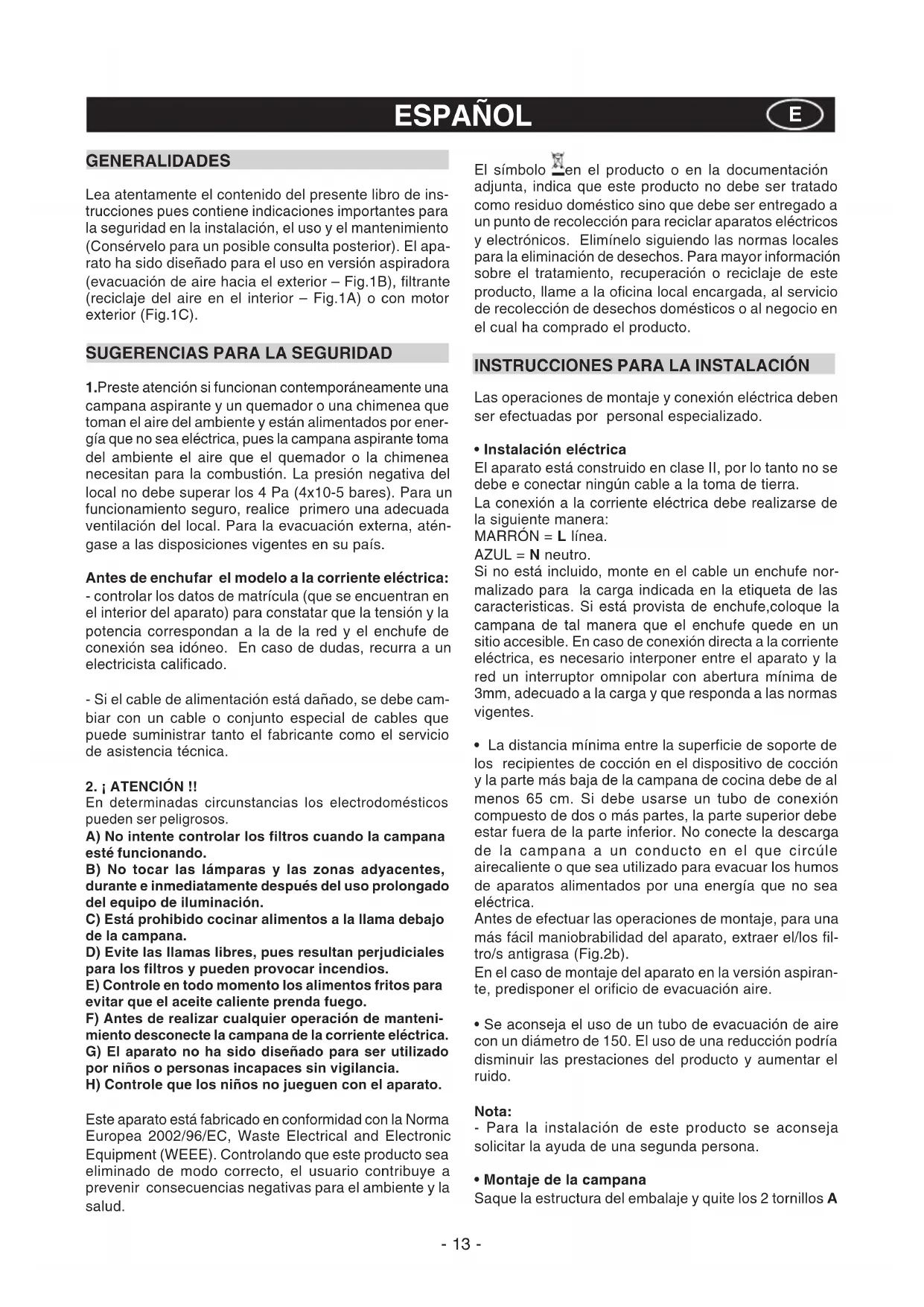 - Montaje de la campana Saque la estructura del embalaje y quite los 2 tornillos A GENERALIDADES Lea atentamente el contenido del presente libro de ins- trucciones pues contiene indicaciones importantes para la seguridad en la instalación, el uso y el mantenimiento (Consérvelo para un posible consulta posterior). El apa- rato ha sido diseñado para el uso en versión aspiradora (evacuación de aire hacia el exterior – Fig.1B), filtrante (reciclaje del aire en el interior – Fig.1A) o con motor exterior (Fig.1C).