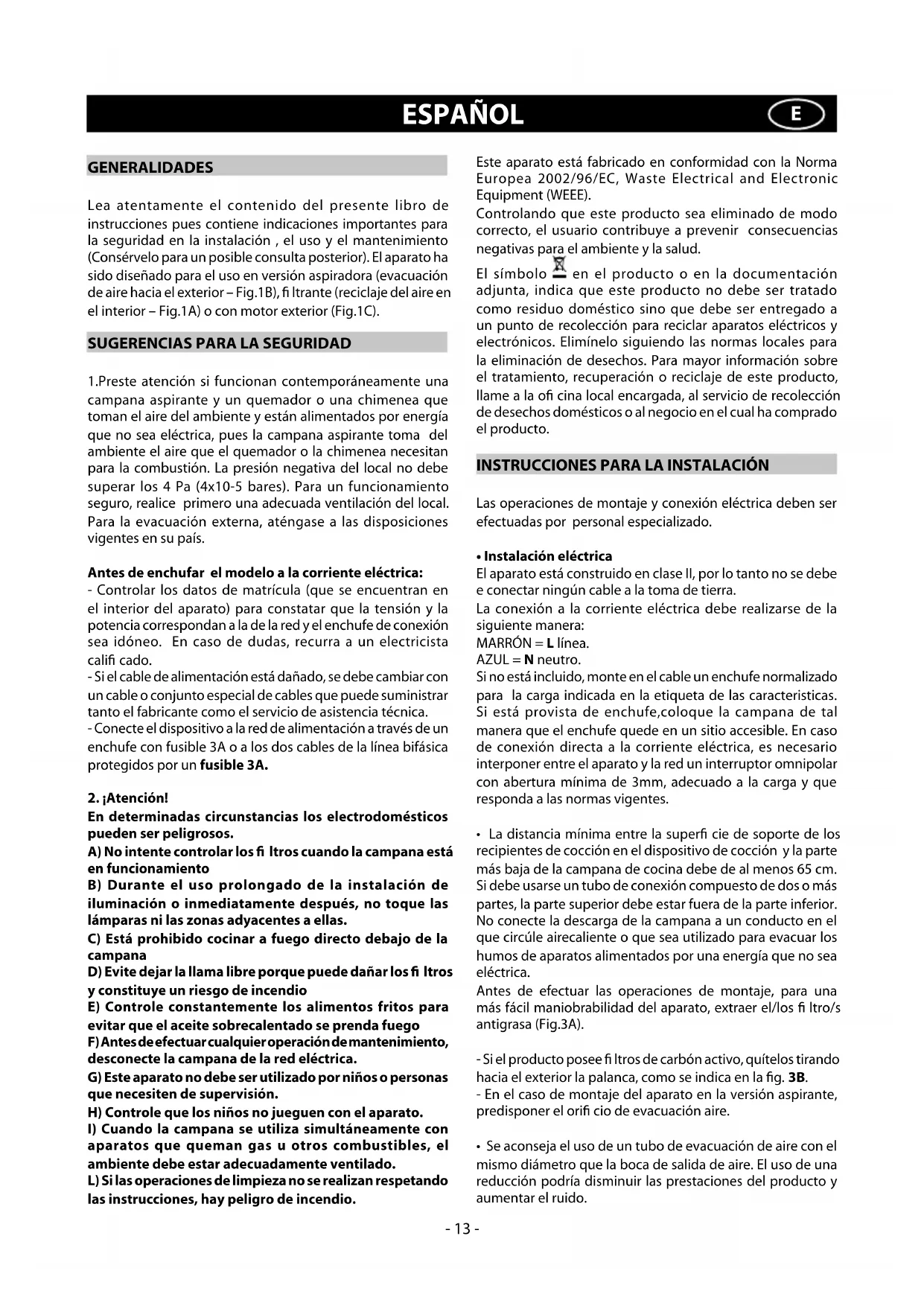 1.Preste atención si funcionan contemporáneamente una campana aspirante y un quemador o una chimenea que toman el aire del ambiente y están alimentados por energía que no sea eléctrica, pues la campana aspirante toma del ambiente el aire que el quemador o la chimenea necesitan para la combustión. La presión negativa del local no debe superar los 4 Pa (4x10-5 bares). Para un funcionamiento seguro, realice primero una adecuada ventilación del local. Para la evacuación externa, aténgase a las disposiciones vigentes en su país. Antes de enchufar el modelo a la corriente eléctrica: - Controlar los datos de matrícula (que se encuentran en el interior del aparato) para constatar que la tensión y la potencia correspondan a la de la red y el enchufe de conexión sea idóneo. En caso de dudas, recurra a un electricista cali cado. - Si el cable de alimentación está dañado, se debe cambiar con un cable o conjunto especial de cables que puede suministrar tanto el fabricante como el servicio de asistencia técnica. - Conecte el dispositivo a la red de alimentación a través de un enchufe con fusible 3A o a los dos cables de la línea bifásica protegidos por un fusible 3A.