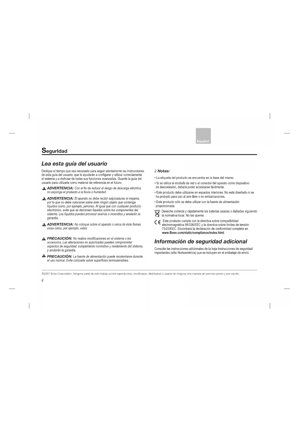©2007 Bose Corporation. Ninguna parte de este trabajo podrá reproducirse, modificarse, distribuirse o usarse de ninguna otra manera sin permiso previo y por escrito.