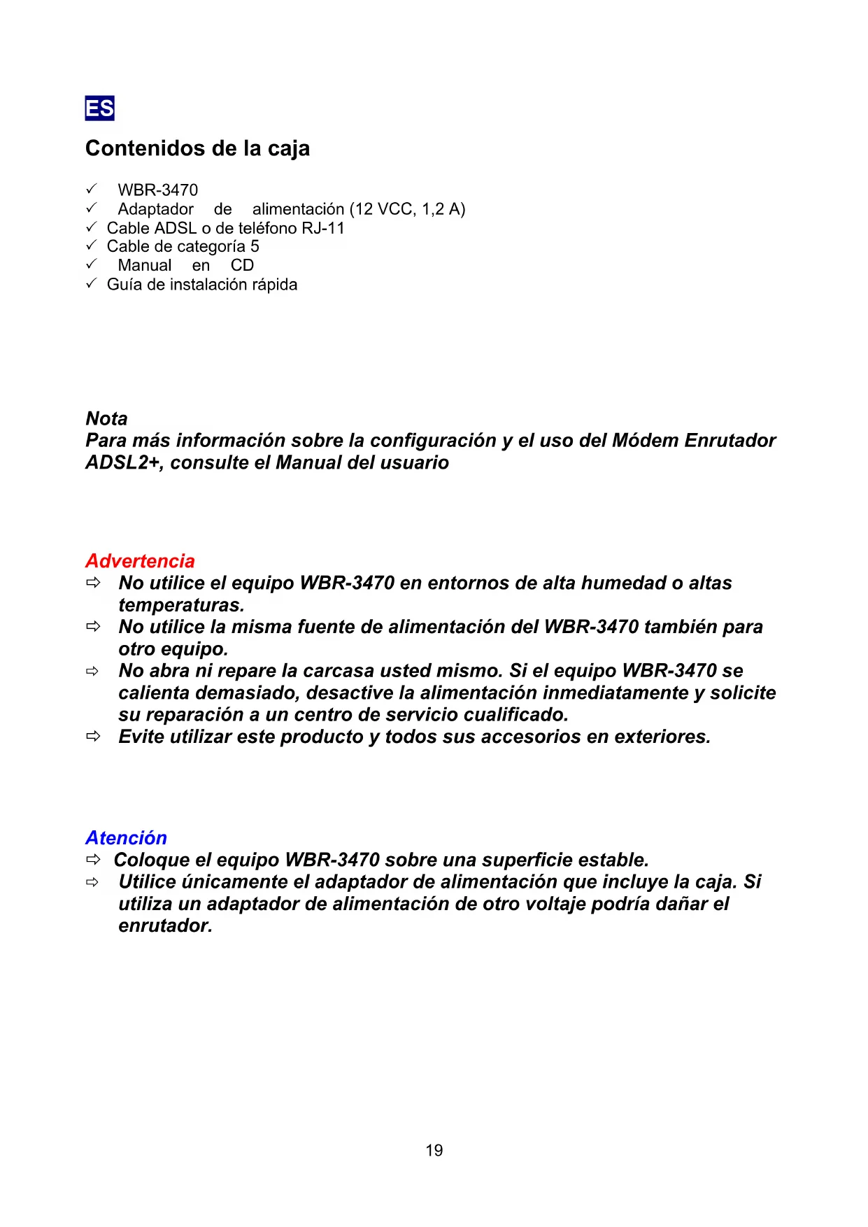18ES Contenidos de la caja 3 WBR-3470 3 Adaptador de alimentación (12 VCC, 1,2 A) 3 Cable ADSL o de teléfono RJ-11 3 Cable de categoría 5 3 Manual en CD 3 Guía de instalación rápida
