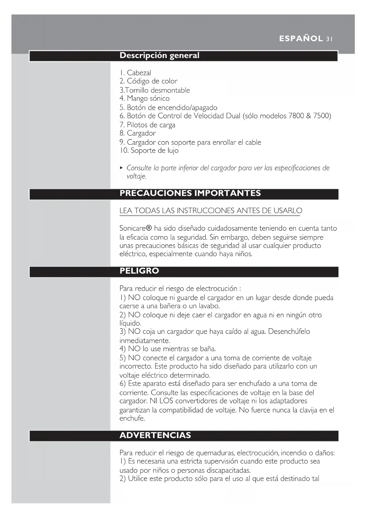 PRECAUCIONES IMPORTANTES LEA TODAS LAS INSTRUCCIONES ANTES DE USARLO Sonicare\ ha sido diseñado cuidadosamente teniendo en cuenta tanto