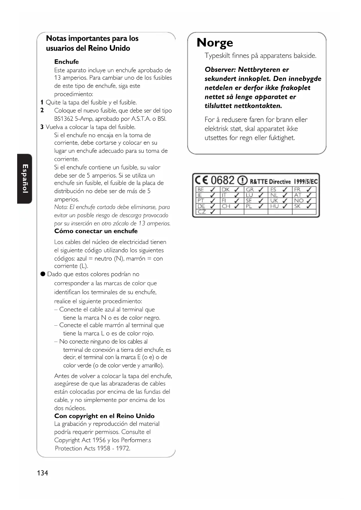 Si el enchufe contiene un fusible, su valor debe ser de 5 amperios. Si se utilizes un enchufe sin fusible, el fusible de la placadistribución no debe ser de mas de 5 amperios.